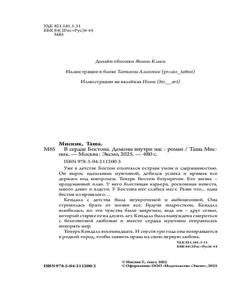 💳 Оплатить за товар можно при получении 🇰🇿 Есть бесплатная доставка по Казахстану от 1 дня 🎁 Копите бонусы с каждой покупки Серия: Под слезами Бостона. Бестселлеры Таши Мисник (покет с клапанами) Заключительная, третья часть чувственного и обжигающего цикла «Под слезами Бостона». Уже в детстве Бостон отличался острым умом и сдержанностью. Он вырос идеальным мужчиной, добился успеха и привык все держать под контролем. Теперь Бостон безупречен. Его жизнь — продуманный план. У него блестящая карьера, роскошная невеста, много денег и власти. У Бостона нет слабых мест. Разве что... Одна бестия из прошлого... Кендалл с детства была неукротимой и амбициозной. Она стремилась брать от жизни все. Будучи подростком, Кендалл влюбилась, но эти чувства были запретны, ведь он — друг семьи, который старше ее на десять лет. Кендалл была вынуждена смириться с безответной любовью и вместо сердца мужчины отправилась покорять мир. Теперь Кендалл восемнадцать. И спустя три года она возвращается в родной город, чтобы заявить права на свою первую любовь. |