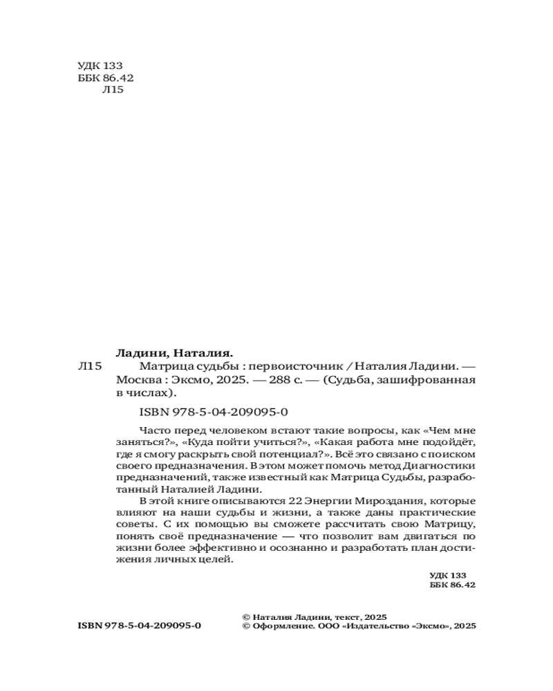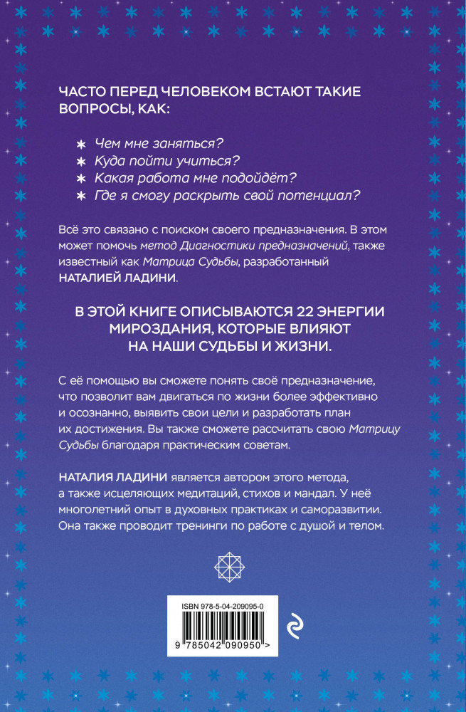 💳 Оплатить за товар можно при получении 🇰🇿 Есть бесплатная доставка по Казахстану от 1 дня 🎁 Копите бонусы с каждой покупки Серия: Судьба, зашифрованная в числах. Книги по нумерологии Часто перед человеком встают такие вопросы, как «Чем мне заняться?», «Куда пойти учиться?», «Какая работа мне подойдёт, где я смогу раскрыть свой потенциал?». Всё это связано с поиском своего предназначения. В этом может помочь метод Диагностики предназначений, также известный как Матрица Судьбы, разработанный Натальей Ладини. В этой книге описываются 22 Энергии Мироздания, которые влияют на наши судьбы и жизни, а также даны практические советы. С их помощью вы сможете рассчитать свою Матрицу, понять своё предназначение — что позволит вам двигаться по жизни более эффективно и осознанно и разработать план достижения личных целей. |