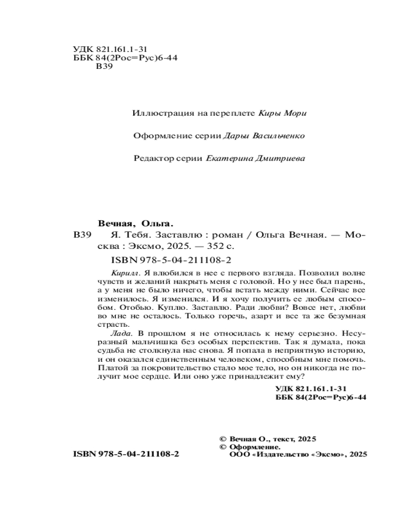 💳 Оплатить за товар можно при получении 🇰🇿 Есть бесплатная доставка по Казахстану от 1 дня 🎁 Копите бонусы с каждой покупки Серия: Долгая дорога к счастью. Истории Ольги Вечной Кирилл. Я влюбился в нее с первого взгляда. Позволил волне чувств и желаний накрыть меня с головой. Но у нее был парень, а у меня не было ничего, чтобы встать между ними. Сейчас все изменилось. Я изменился. И я хочу получить ее любым способом. Отобью. Куплю. Заставлю. Ради любви? Вовсе нет, любви во мне не осталось. Только горечь, азарт и все та же безумная страсть. |
