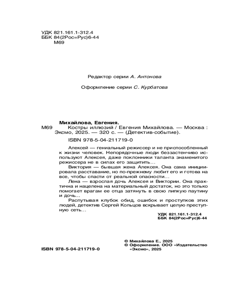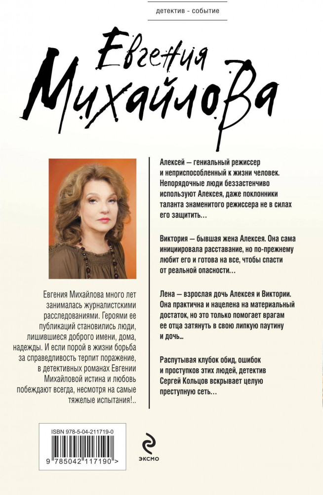 💳 Оплатить за товар можно при получении 🇰🇿 Есть бесплатная доставка по Казахстану от 1 дня 🎁 Копите бонусы с каждой покупки Серия: Детектив-событие Алексей — гениальный режиссер и неприспособленный к жизни человек. Непорядочные люди беззастенчиво используют Алексея, даже поклонники таланта знаменитого режиссера не в силах его защитить... Виктория — бывшая жена Алексея. Она сама инициировала расставание, но по-прежнему любит его и готова на все, чтобы спасти от реальной опасности... Лена — взрослая дочь Алексея и Виктории. Она практична и нацелена на материальный достаток, но это только помогает врагам ее отца затянуть в свою липкую паутину и дочь... |