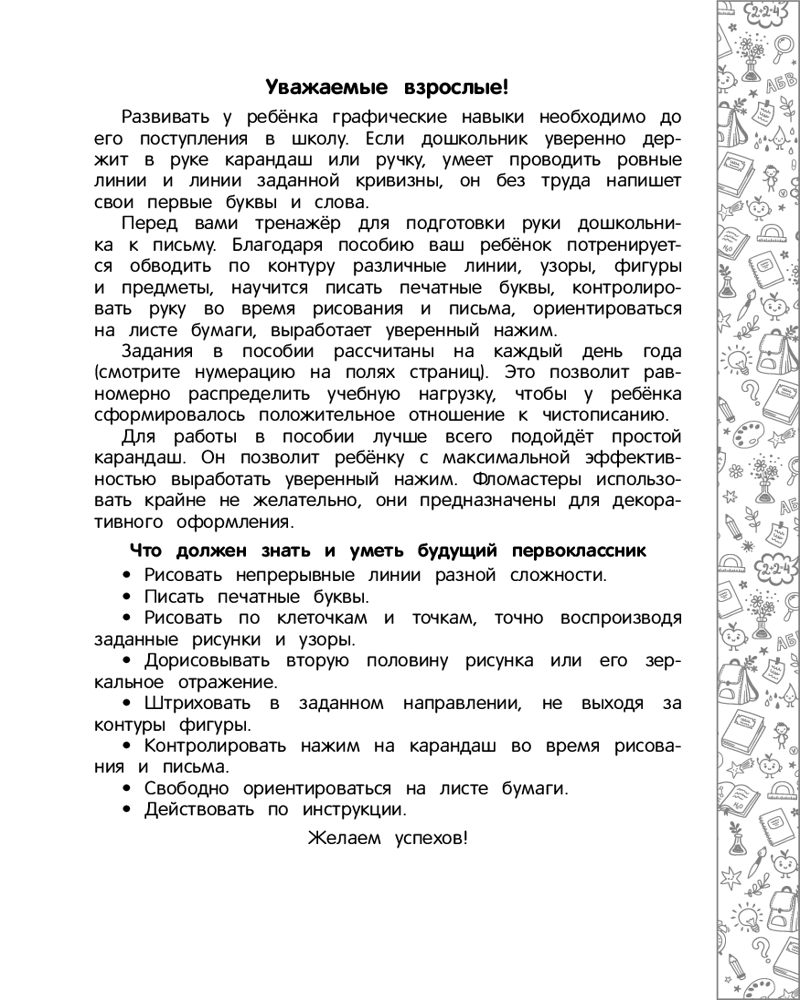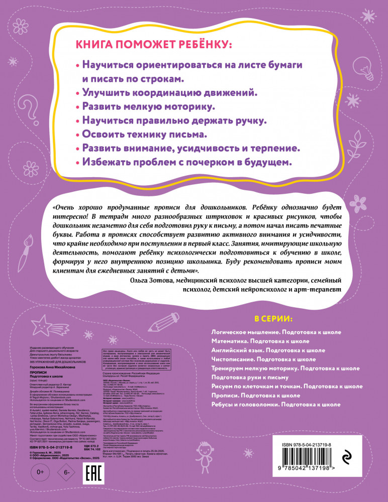 💳 Оплатить за товар можно при получении 🇰🇿 Есть бесплатная доставка по Казахстану от 1 дня 🎁 Копите бонусы с каждой покупки Серия: 365 упражнений для дошкольников Эта книга для детей от 5 лет поможет дошкольнику развить мелкую моторику рук, научиться писать буквы, как это делают ученики первого класса, и сформировать красивый почерк. В прописях более 365 упражнений по чистописанию, рассчитанных на каждый день года. Это способствует равномерному распределению учебной нагрузки и формированию положительного отношения ребёнка к обучению в школе. Дошкольник потренируется обводить рисунки и рисовать их по образцу, писать элементы букв, буквы и целые слова. Он научится ориентироваться на листе бумаги, писать, придерживаясь строки, станет внимательным, аккуратным, самостоятельным и приобретёт другие важные навыки, необходимые при обучении в школе. |