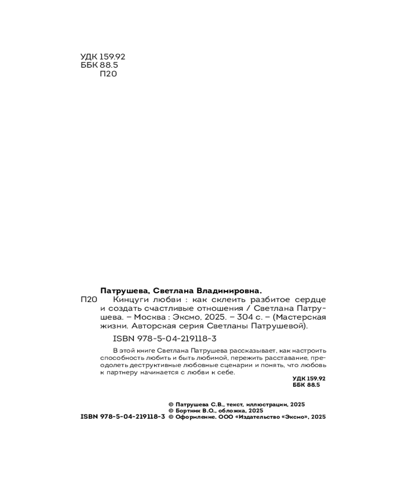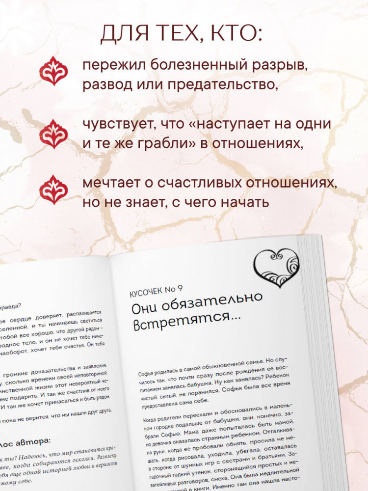 💳 Оплатить за товар можно при получении 🇰🇿 Есть бесплатная доставка по Казахстану от 1 дня 🎁 Копите бонусы с каждой покупки Серия: Мастерская жизни. Авторская серия Светланы Патрушевой «Почему мои отношения заканчиваются крахом?», «Где же мой любимый?», «Мне часто попадаются не те!»... Такие мысли, словно заезженная пластинка, крутятся в голове, мешают жить и быть счастливой. Может, все дело не только в умении подбирать партнера, но и в изменении привычных сценариев любви? Светлана Патрушева рассказывает, как настроить способность любить и быть любимой, пережить расставание, преодолеть деструктивные любовные сценарии и понять, что любовь к партнеру начинается с любви к себе. В книге нет привычных глав, а есть «кусочки», которые собираются во что-то прекрасное и целое. Склеить сердце помогут авторские практики и инструменты, а также реальные истории, над которыми захочется посмеяться или поплакать. |