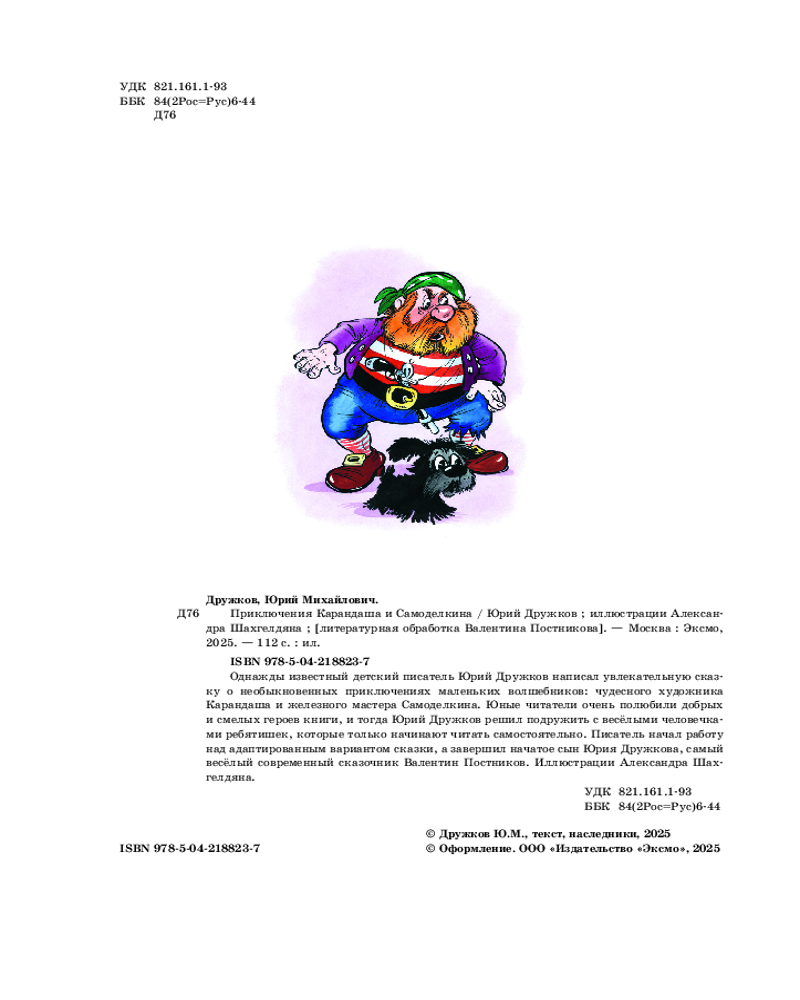 Серия: Золотые сказки для детей Много лет назад известный детский писатель Юрий Михайлович Дружков придумал увлекательную сказочную повесть о необыкновенных приключениях двух весёлых человечков. Волшебный художник Карандаш умел рисовать оживающие картинки, а чудесный мастер Самоделкин мог починить всё, что угодно. Юные читатели сразу полюбили удивительных героев. Но писателю сразу же стали приходить письма от тех пап и мам, чьи дети только начинали знакомиться с чтением. Родители очень просили Юрия Дружкова сделать такую книгу про Карандаша и Самоделкина, чтобы её могли прочитать самостоятельно даже маленькие дети. И, конечно, Юрий Михайлович не мог отказать в этой просьбе. Он начал готовить сокращённую версию «Приключений». Эту работу завершил сын Юрия Дружкова, популярный современный сказочник Валентин Постников. |