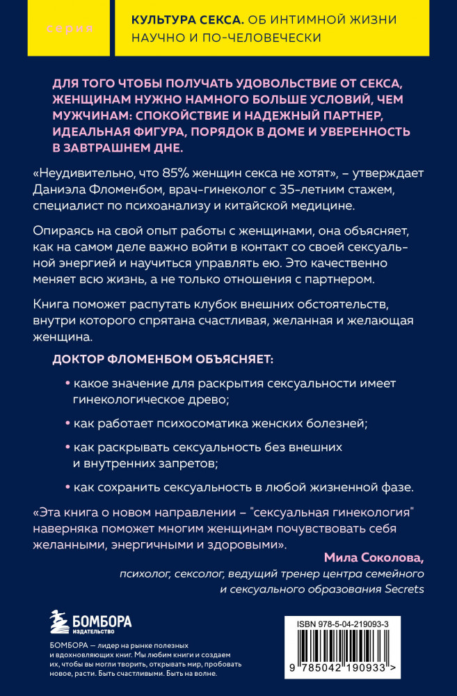 💳 Оплатить за товар можно при получении 🇰🇿 Есть бесплатная доставка по Казахстану от 1 дня 🎁 Копите бонусы с каждой покупки Серия: Культура секса. Об интимной жизни научно и по-человечески Для того, чтобы получать удовольствие от секса, женщинам нужно намного больше условий, чем мужчинам: спокойствие и надежный партнер, идеальная фигура, порядок в доме и уверенность в завтрашнем дне. Не удивительно, что 85% женщин секса не хотят, — утверждает Даниэла Фломенбом, врач-гинеколог с 35-летним стажем, специалист по психоанализу и китайской медицине. Опираясь на свой опыт работы с женщинами, она объясняет, как на самом деле важно войти в контакт со своей сексуальной энергией и научиться управлять ею. Это качественно меняет всю жизнь, а не только отношения с партнером. Книга поможет распутать клубок внешних обстоятельств, внутри которого спрятана счастливая, желанная и желающая женщина. |
