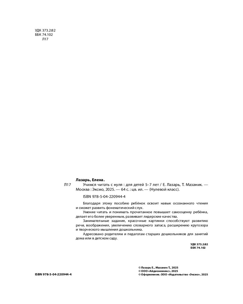 💳 Оплатить за товар можно при получении 🇰🇿 Есть бесплатная доставка по Казахстану от 1 дня 🎁 Копите бонусы с каждой покупки Серия: Нулевой класс Книга по обучению чтению с нуля, соответствующая ФГОС, специально разработана для того, чтобы превратить обучение в интересное познавательное приключение. Пособие включает в себя упражнения на чтение слогов, слов, предложений и небольших текстов, а также вопросы на понимание и увлекательные упражнения на развитие фонематического слуха, логического мышления, развитие речевых навыков и расширение словарного запаса. |