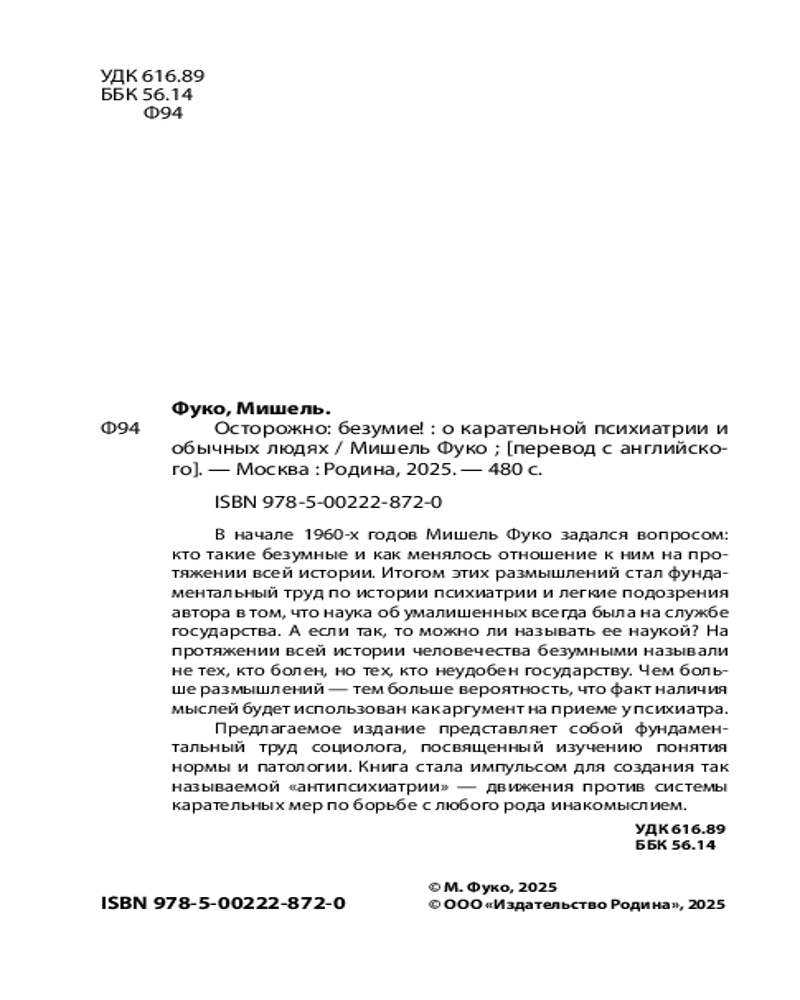 💳 Оплатить за товар можно при получении 🇰🇿 Есть бесплатная доставка по Казахстану 🎁 Копите бонусы с каждой покупки Серия: Диагноз. Покет B начале 1960-х годов Mишель Фуко задался вопросом: кто такие безумные и как менялось отношение к ним на протяжении всей истории. Итогом этих размышлений стал фундаментальный труд по истории психиатрии и легкие подозрения автора в том, что наука об умалишенных всегда была на службе государства. A если так, то можно ли называть ее наукой? На протяжении всей истории человечества безумными называли не тех, кто болен, но тех, кто неудобен государству. Чем больше размышлений — тем больше вероятность, что факт наличия мыслей будет использован как аргумент на приеме у психиатра. |
