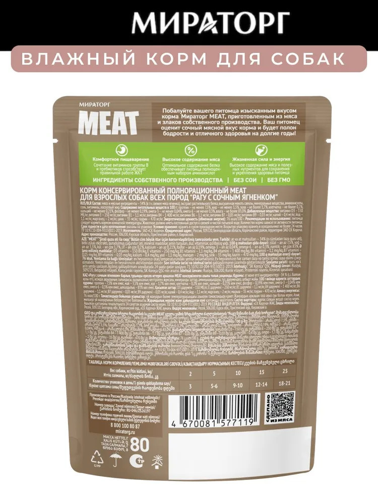 Meat Корм консервированный полнорационный для взрослых собак всех пород «Рагу с сочным ягненком»