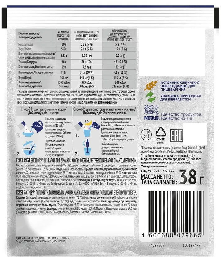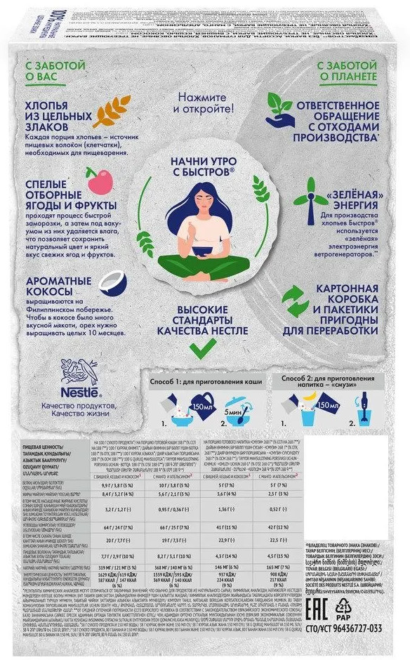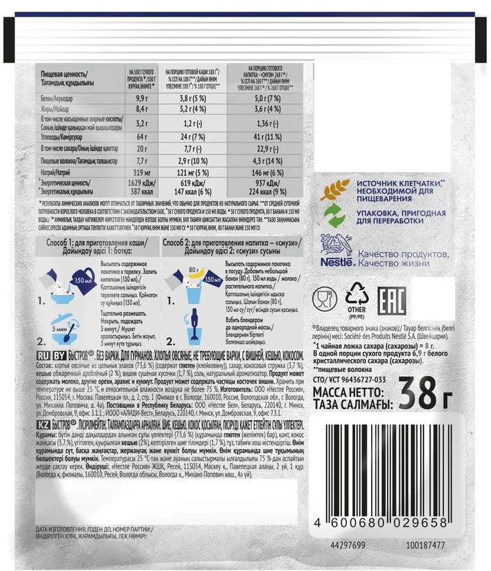 Утром завариваю один пакетик и каша готова! добавляю молоко 6%, отправляю на 30 секунд в микроволновку, и всё прекрасно! Рекомендую.