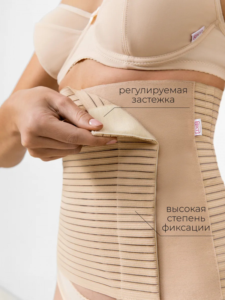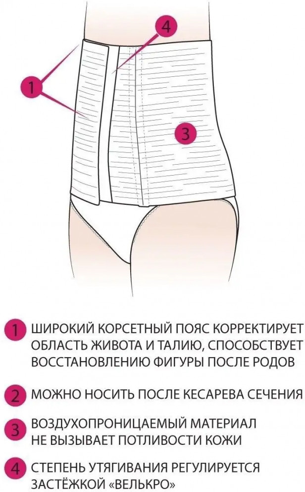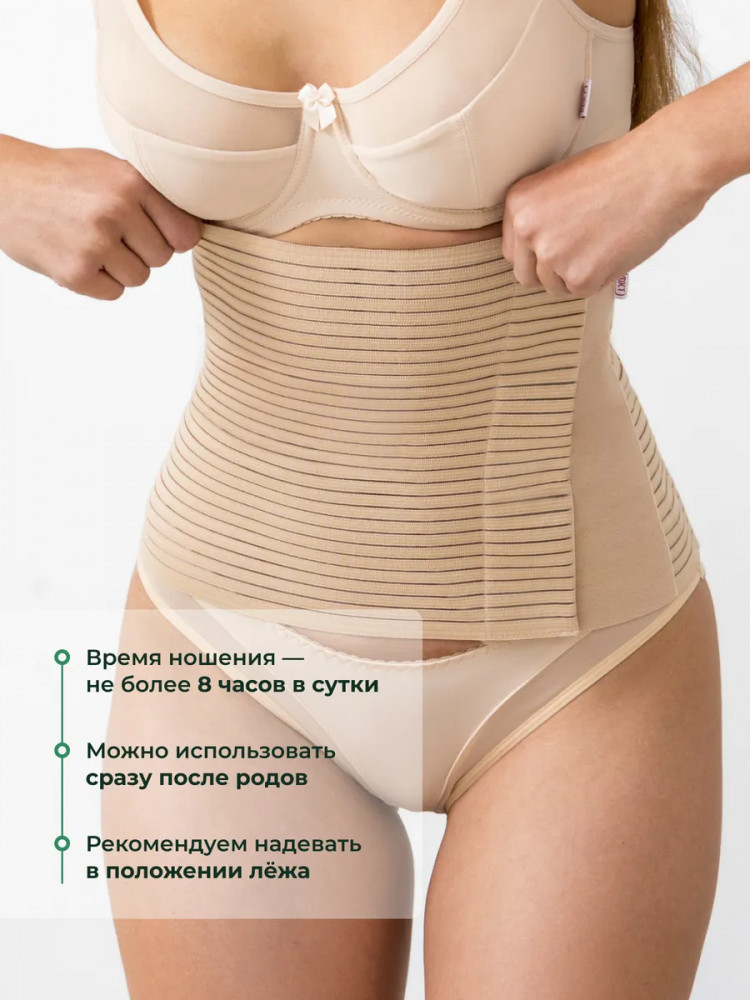 Его рекомендуется использовать не только, как бандаж после кесарева сечения, но и как бандаж для похудения. Эффективно выполняет функцию утяжки живота. Корсет послеродовой утягивающий изготовлен из качественных материалов. Фиксирует и укрепляет мышцы живота, создавая красивую фигуру у женщин. При отсутствии противопоказаний, послеродовой бандаж утягивающий следует начинать носить с первых дней после родов, ежедневно, в течение полутора месяцев. Во время сна применять специальное белье не рекомендуется. Изготовлен в виде широкого корсетного пояса, корректирует область живота и талию способствует восстановлению фигуры, помогает для похудения. Степень утягивания регулируется при помощи застежки «велькро», известной всем как «липучка». Воздухопроницаемая ткань приятно прилегает к телу и не раздражает шов. Высота бандажа 30 см.