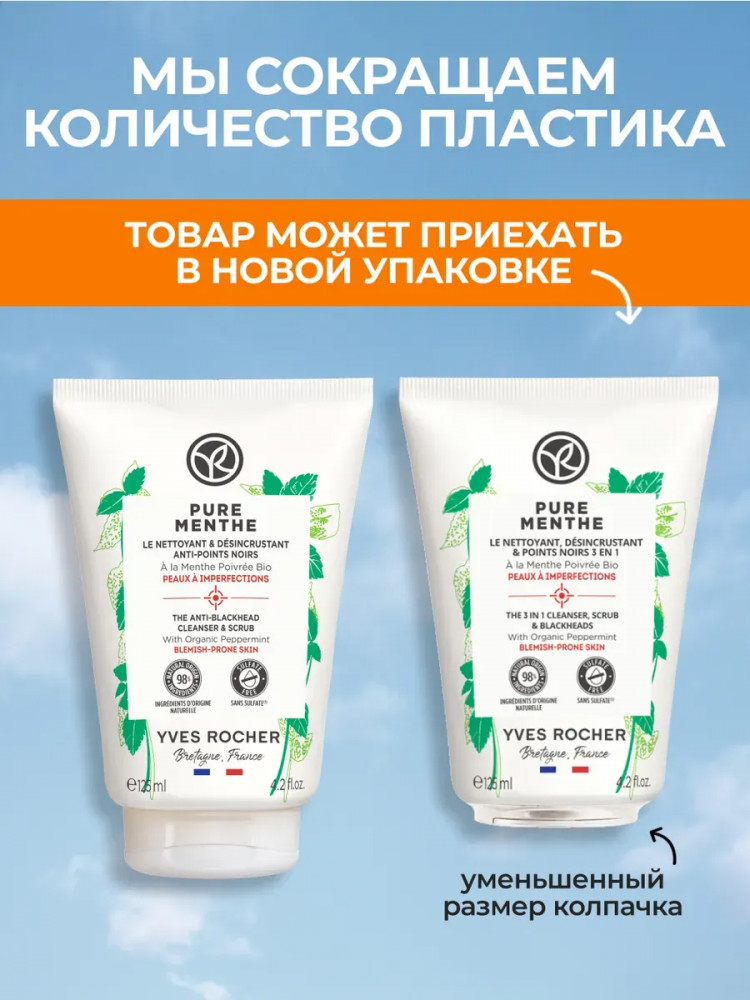 Yves Rocher Гель-гоммаж для умывания кожи, склонной к несовершенствам, с перечной мятой 3 в 1 «Против черных точек. Pure menthe»
