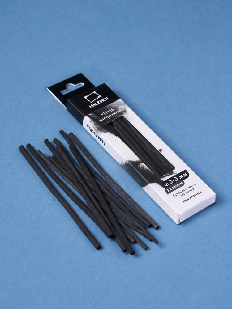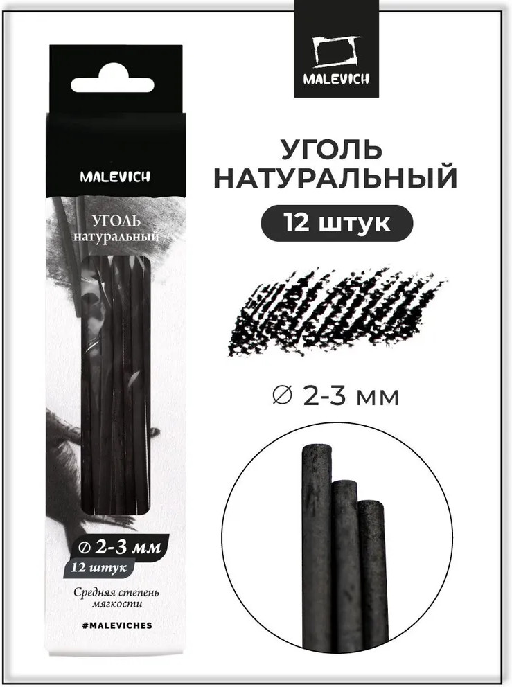 Натуральный уголь — самый мягкий и самый насыщенно черный из всех видов угля, это позволяет достичь ярких и глубоких оттенков на холсте или бумаге, плавных тоновых переходов. Художественный уголь Малевич хорошо передает пигмент на бумагу, но при этом остается твердым и не ломается. Его можно использовать вместе с соусом, а также для создания эскизов, подмалевок для картин маслом.