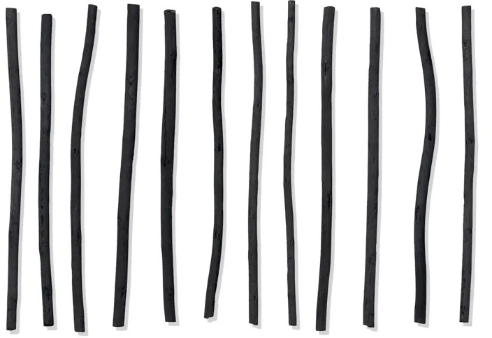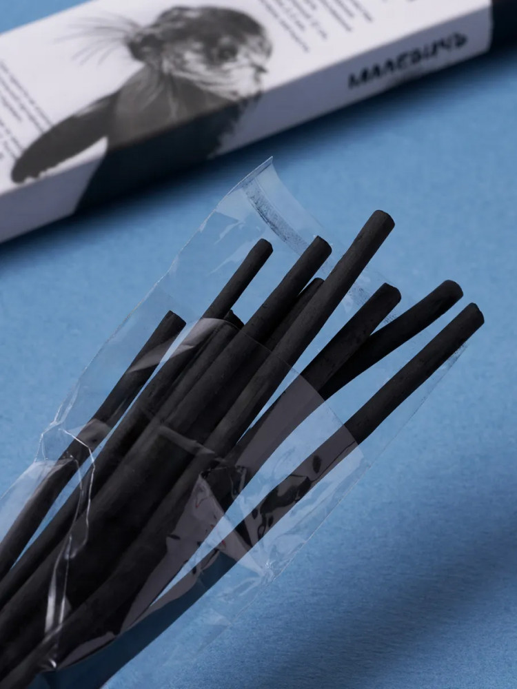 Уголь натуральный от Малевичъ — это традиционный материал для рисования в художественной графике. Форма палочки позволяет делать и четкие тонкие штрихи, и обширные сплошные штриховки при использовании плашмя. В набор входит 12 тонких палочек натурального ивового угля с круглым сечением: длина 12 см, диаметр примерно 2-3 мм.
