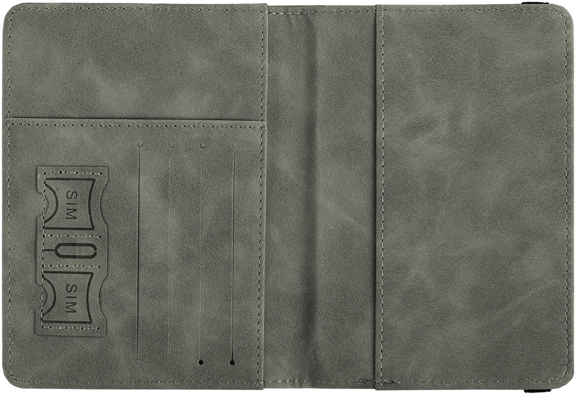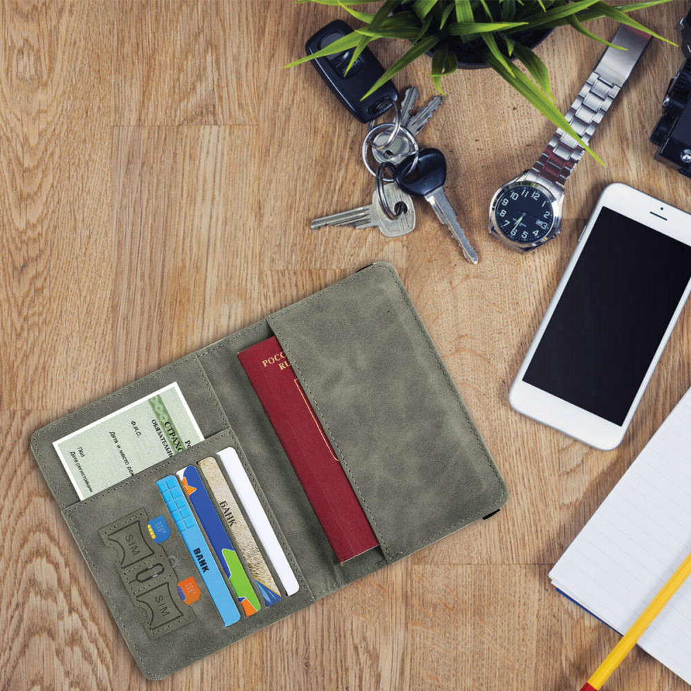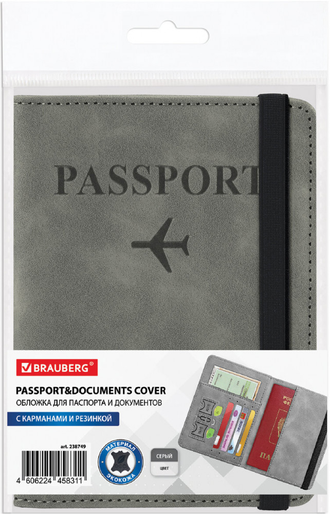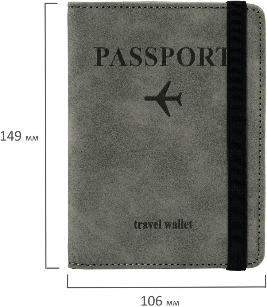 Обложка для паспорта BRAUBERG защитит документ от износа и загрязнений, сохраняя его аккуратный внешний вид. Модель выполнена из экокожи серого цвета c приятной на ощупь soft touch-поверхностью и украшена тиснением в виде надписи «Passport», «travel wallet» и силуэта самолета.