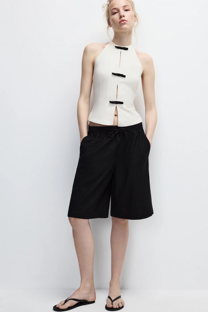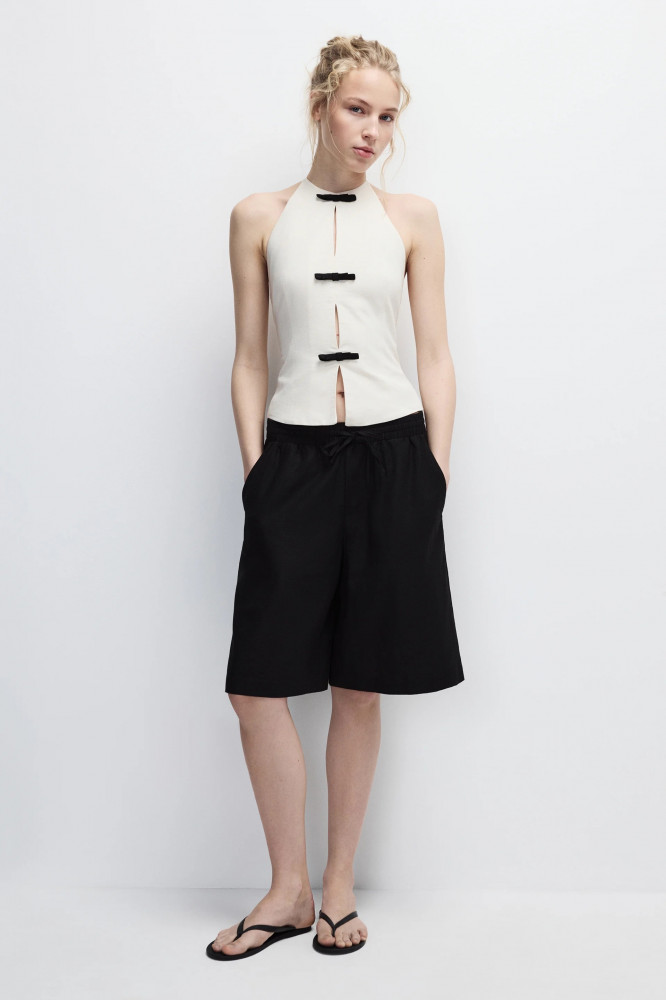- Короткие женские шорты свободного прямого кроя из легкой, дышащей ткани на основе хлопка и вискозы с добавлением льна - Классическая средняя посадка выгодно подчеркивает фигуру и акцентирует внимание на талии. Эластичный пояс-резинка на завязках. Два боковых кармана с отрезным бочком. Короткие штанины выше колена без разрезов и декоративных элементов - Стильные и очень легкие широкие шорты из мягкой ткани для стильных и женственных аутфитов на каждый день или по особым поводам. Для повседневных луков дополни их своим любимым верхом. Или короткими топами для более соблазнительных вечерних аутфитов. Трендовые однотонные шорты идеально подойдут на теплое время года. Обязательно возьми шорты в отпуск на море или за город.
