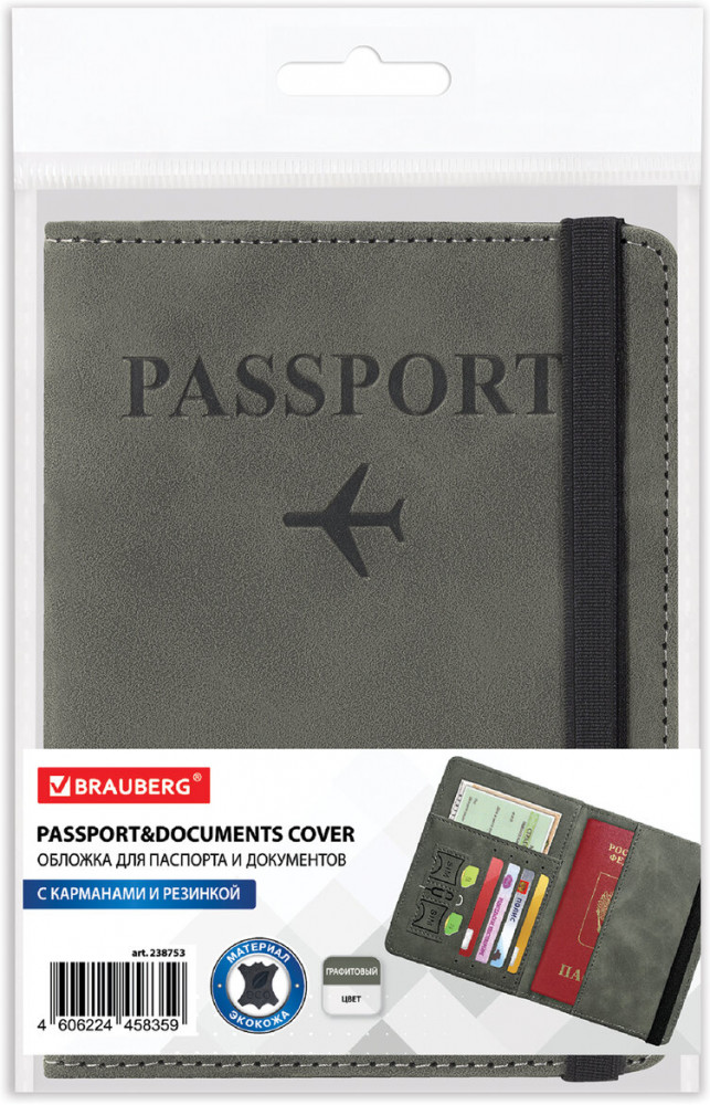 Обложка для паспорта Brauberg защитит документ от износа и загрязнений, сохраняя его аккуратный внешний вид. Модель выполнена из экокожи графитового цвета c приятной на ощупь soft touch-поверхностью и украшена тиснением в виде надписи «Passport», «travel wallet» и силуэта самолета.