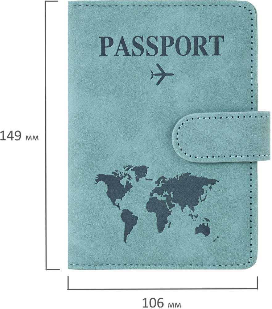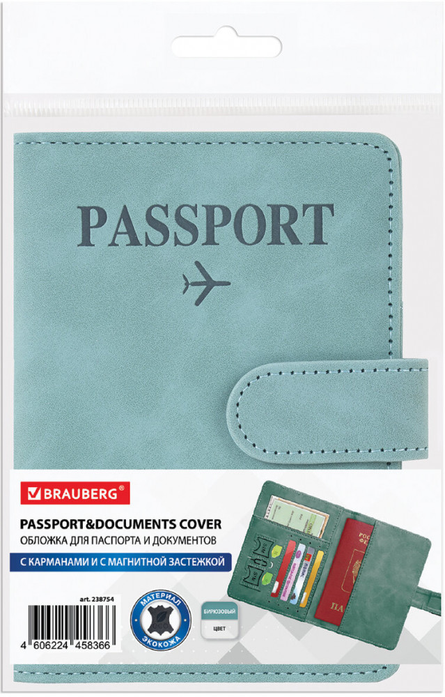 Обложка для паспорта Brauberg защитит документ от износа и загрязнений, сохраняя его аккуратный внешний вид. Модель выполнена из экокожи бирюзового цвета c приятной на ощупь soft touch-поверхностью и украшена тиснением в виде надписи «Passport», силуэта самолета и карты мира.