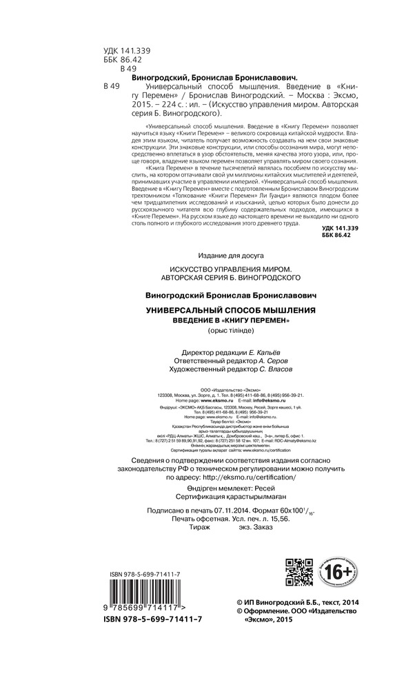 Универсальный способ мышления. Введение в "Книгу Перемен"Бронислав Брониславович Виногродский В данный момент этот товар отсутствует в продаже. Возможно, у нас найдется аналогичный или похожий товар здесь. Серия: Искусство управления миром «Универсальный способ мышления. Введение в Книгу Перемен» позволяет научиться языку «Книги Перемен» - великого сокровища китайской мудрости. Владея этим языком читатель получает возможность создавать на нем свои знаковые конструкции. Эти знаковые конструкции, или способы осознания мира, могут непосредственно вплетаться в узор обстоятельств, меняя качества этого узора, или проще говоря, владение языком перемен позволяет управлять миром своего сознания. |