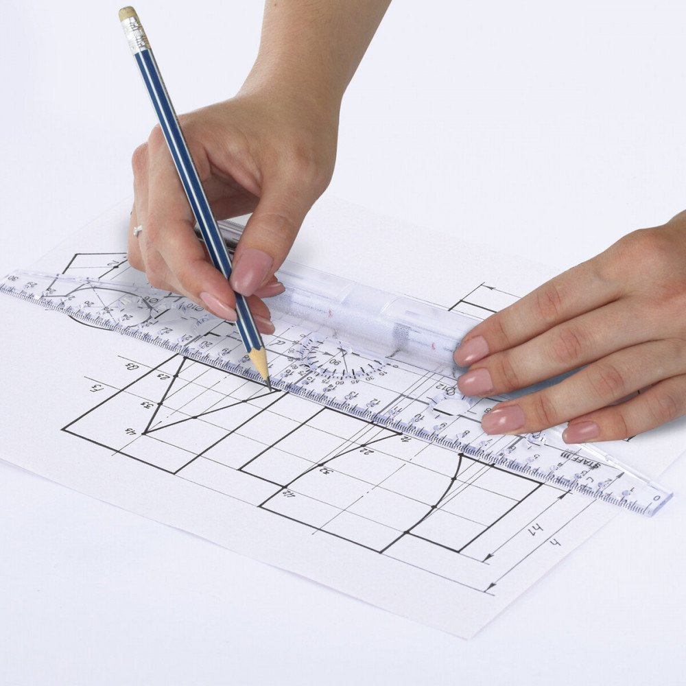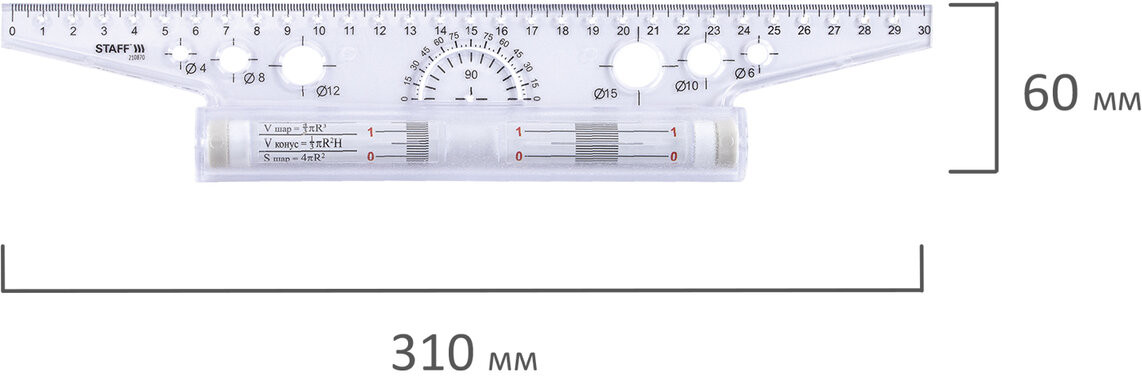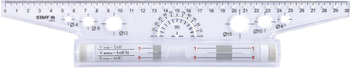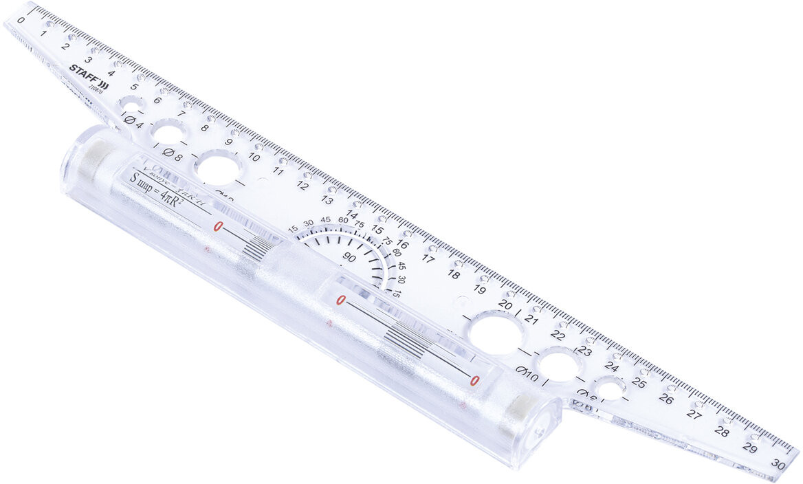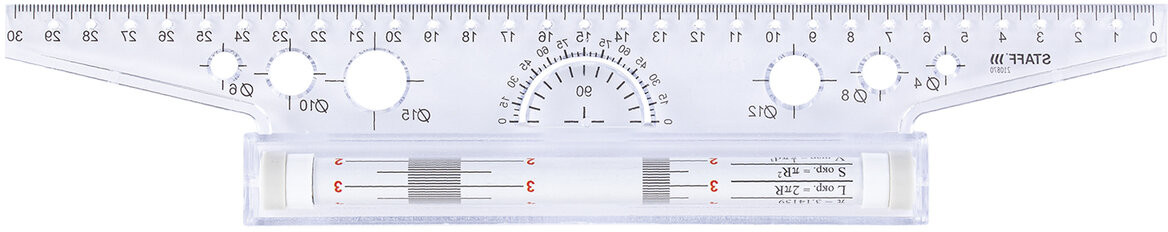 Изготовлена из высокопрочного пластика. Оснащена металлическим антискользящим роликом, на котором изображена измерительная шкала и геометрические формулы. Длина шкалы составляет 30 см. На линейку нанесена измерительная шкала и шкала транспортира. Также снабжена трафаретом окружностей различных диаметров. На ролике нанесена дополнительная шкала и геометрические формулы.
