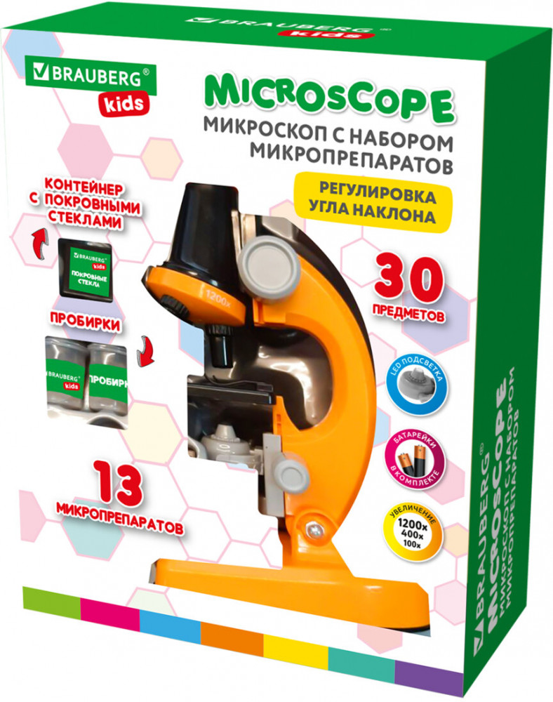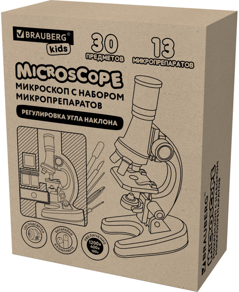 Уникальный развивающий и обучающий микроскоп Brauberg Kids! станет первым шагом ребёнка в мир науки. Даже учёба с ним станет веселее и увлекательнее. Пробудите интерес ребёнка к исследованию с подарочным набором микропрепаратов для экспериментов! Микроскоп Brauberg Kids! - готовый набор юного учёного! Он прост в использовании и укомплектован всем необходимым для того, чтобы каждый ребёнок мог почувствовать себя настоящим исследователем. Оптика высокого качества обеспечивает увеличение (произведение кратности увеличения окуляра на кратность увеличения объектива) в 100х, 400х и даже 1200х. Встроенная LED-подсветка (батарейки в комплекте) создаст оптимальное освещение во время наблюдений. Микроскоп укомплектован 30 предметами для экспериментов, в том числе ПОДАРОЧНЫМ набором из 12 микропрепаратов.