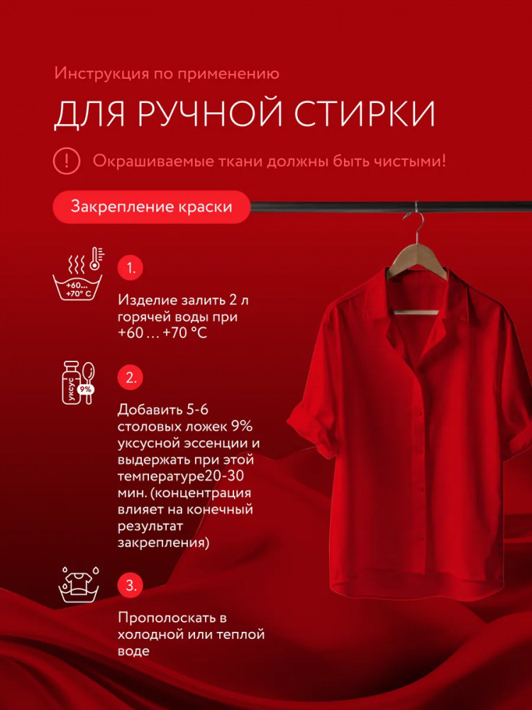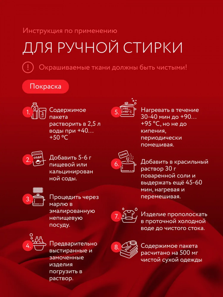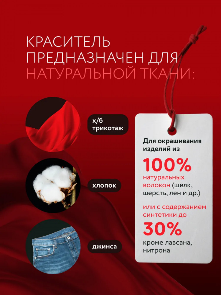Прежде чем приступить к окрашиванию, убедитесь, что ткань чистая. Краситель не рекомендуется использовать для лавсана и нитрона, но подходит для большинства натуральных тканей и смесей, содержащих не более 30% синтетических волокон. Глубина цвета зависит от объема синтетических волокон в материале.