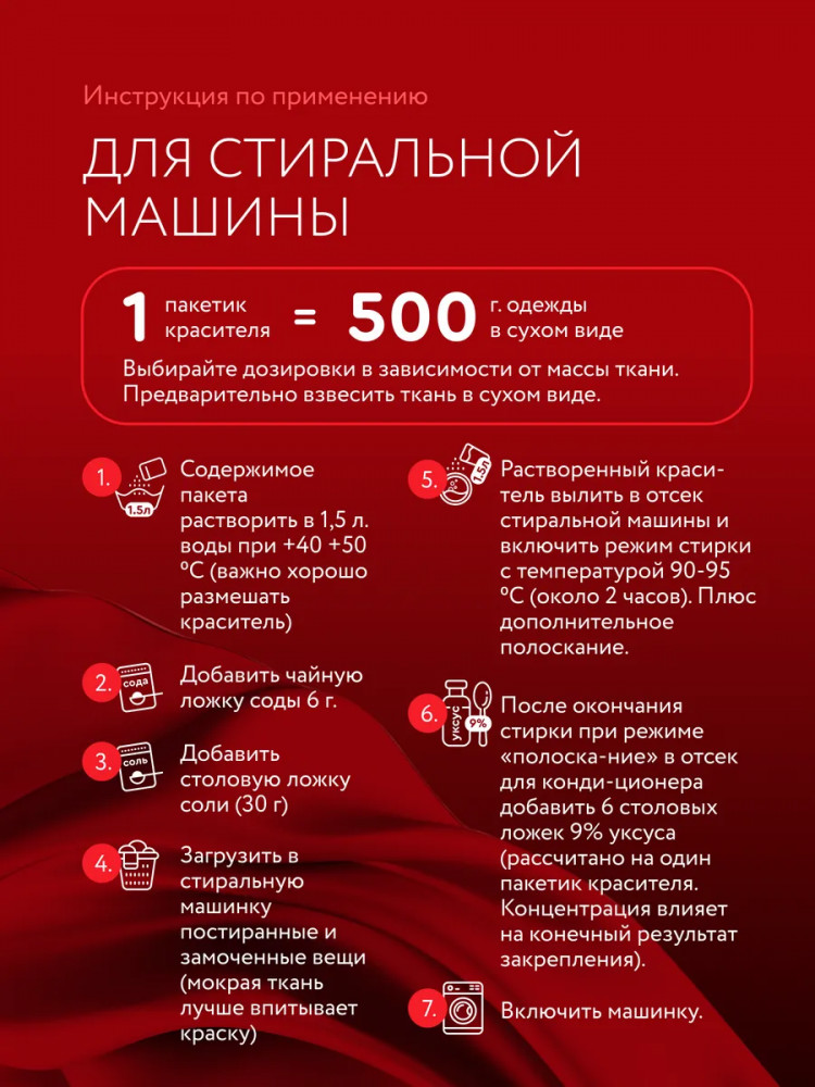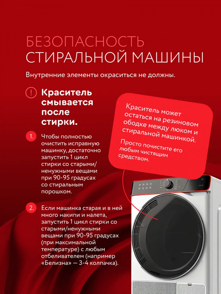 Так как краситель может впитаться в известковые отложения в стиральной машине, по завершению окрашивания рекомендуем запустить режим самоочистки с добавлением средства против накипи, либо постирать ненужные темные вещи при высокой температуре также с добавлением средства против накипи.