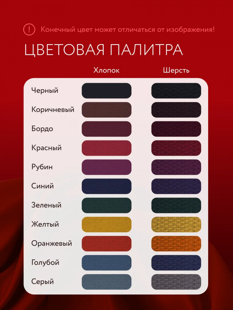 Внимание! Итоговый цвет зависит от состава ткани, а также от концентрации красителя. Вы можете посмотреть примеры прокрасов хлопка и шерсти на фото в карточке товара.