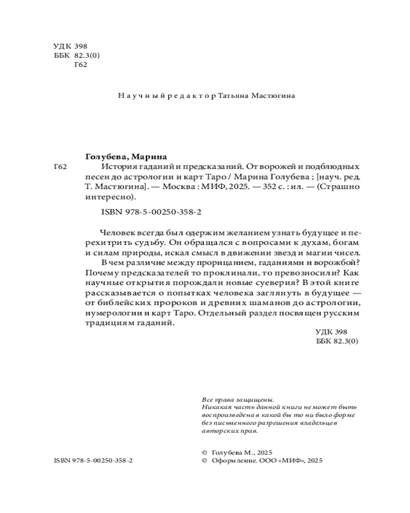 💳 Оплатить за товар можно при получении 🇰🇿 Есть бесплатная доставка по Казахстану от 1 дня 🎁 Копите бонусы с каждой покупки Серия: Страшно интересно Увлекательная история предсказаний, охватывающая множество культур и эпох. Новинка серии «Страшно интересно». Человек всегда был одержим желанием узнать будущее и перехитрить судьбу. Он обращался с вопросами к духам, богам и силам природы, искал смысл в движении звезд и магии чисел. |