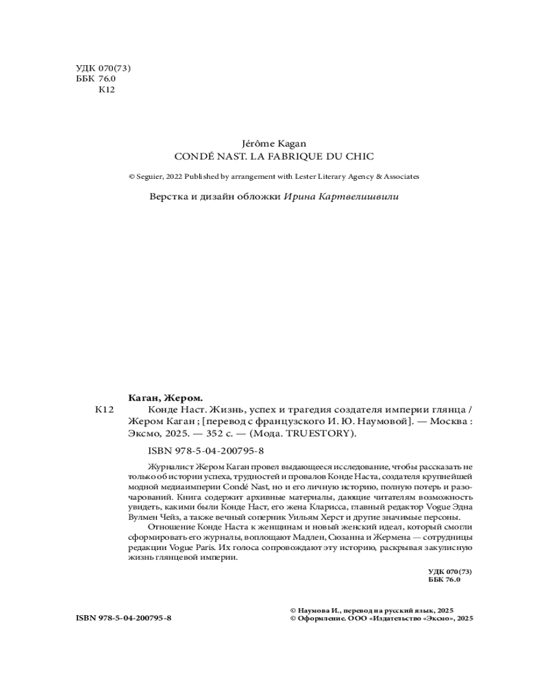 💳 Оплатить за товар можно при получении 🇰🇿 Есть бесплатная доставка по Казахстану от 1 дня 🎁 Копите бонусы с каждой покупки Серия: Мода. Truestory Эта книга рассказывает о жизни и невероятном успехе Конде Наста — основателя крупнейшей модной медиа-империи Condé Nast. Для одних он был бизнесменом с удивительным чутьём, для других — суровым трудоголиком. Конде всегда старался оставаться в тени, что порождало множество слухов, мифов и даже легенд. Кем же на самом деле был этот болезненно-скромный мужчина, которого считают прототипом главного героя романа «Великий Гэтсби»? Журналист Жером Каган провёл выдающееся расследование, чтобы раскрыть многочисленные секреты отца гламура. |