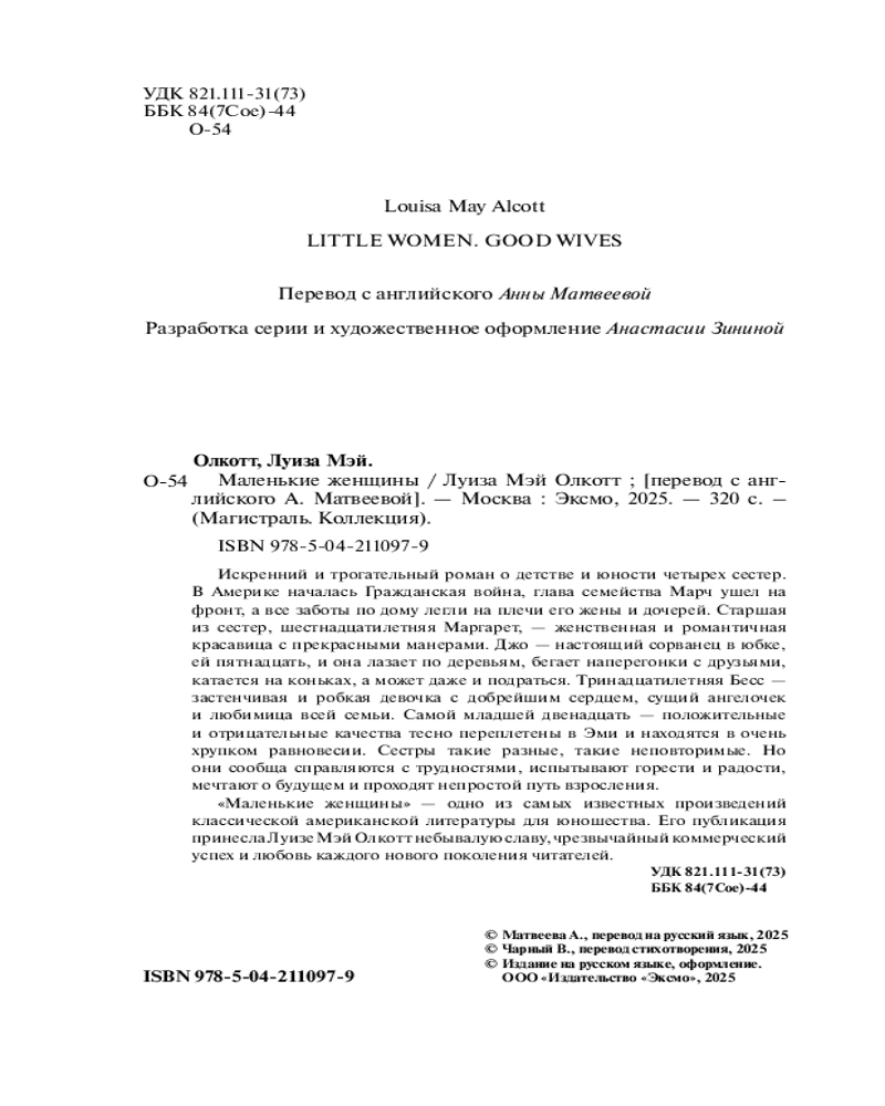 💳 Оплатить за товар можно при получении 🇰🇿 Есть бесплатная доставка по Казахстану от 1 дня 🎁 Копите бонусы с каждой покупки Серия: Магистраль. Коллекция Трогательная книга, которая читается с улыбкой на лице. Светлая история, которая вселяет надежду. Доброе чтение, которое отвлекает от бед и погружает в атмосферу уюта и тепла. Сюжет «Маленьких женщин» словно создан для моментов, когда очень хочется, чтобы жизнь наполнилась позитивными эмоциями. Олкотт писала о девушках и для девушек. На страницах этой книги юные красавицы увидят, как их ровесницы проживают актуальные для них проблемы, а молодые мамы снова окунутся в свое счастливое беззаботное детство, вспомнят свои веселые шалости, свою первую любовь. |