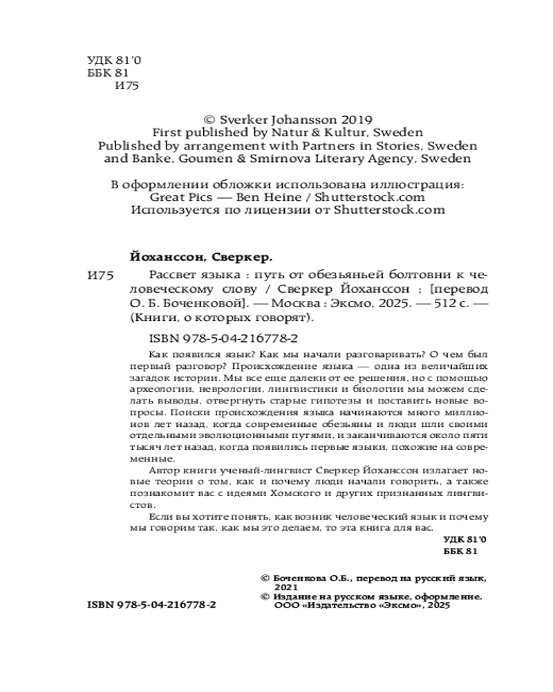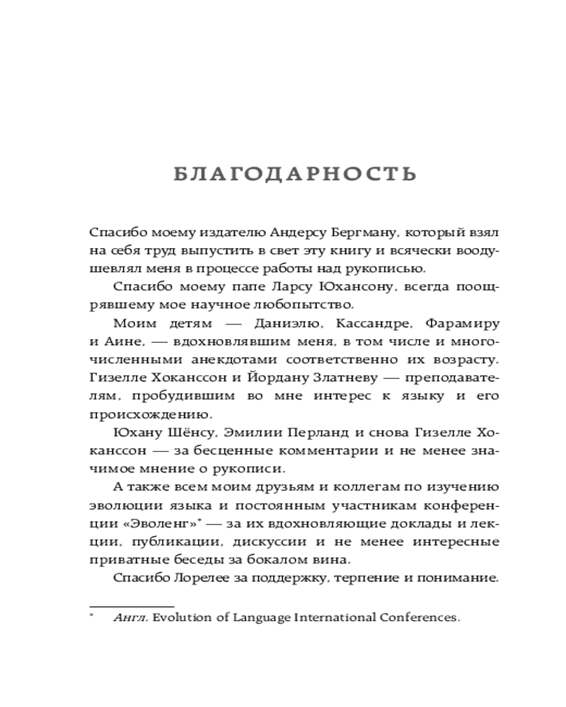Рассвет языка. Путь от обезьяньей болтовни к человеческому слову. История о том, как мы начали говоритьВ данный момент этот товар отсутствует в продаже. Возможно, у нас найдется аналогичный или похожий товар здесь. Серия: Книги, о которых говорят Принято считать, что язык служит нам исключительно для коммуникации посредством передачи сообщений. Некоторые ученые придерживаются мнения, что язык, по своему изначальному замыслу, был ближе к музыке или песне и нес такую же информацию, что и соловьиные трели. Но чтобы язык развился в нечто такое, что он представляет собой сегодня, функция передачи значимых в смысловом отношении сообщений должна была существовать уже на ранней стадии. Логично предположить, что язык мысли произошел от языка коммуникации. Вывод: праязык был коммуникативным. |