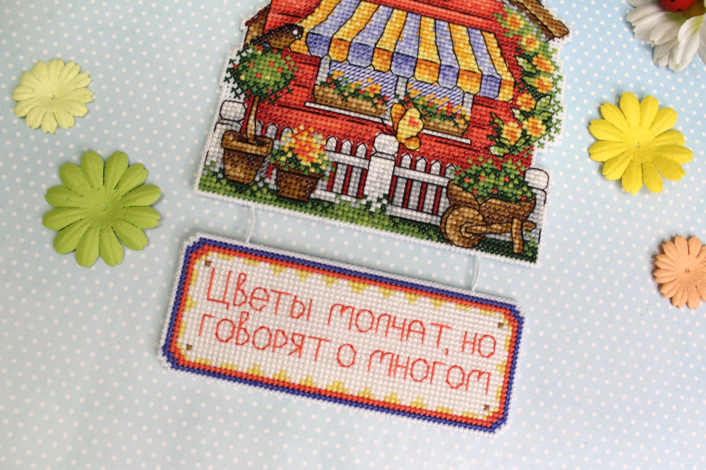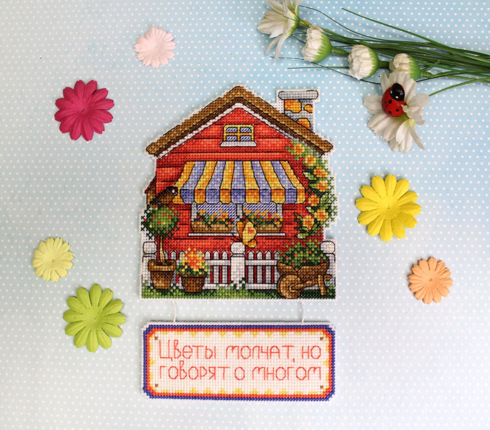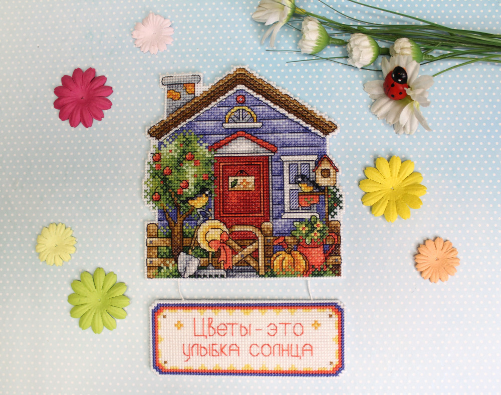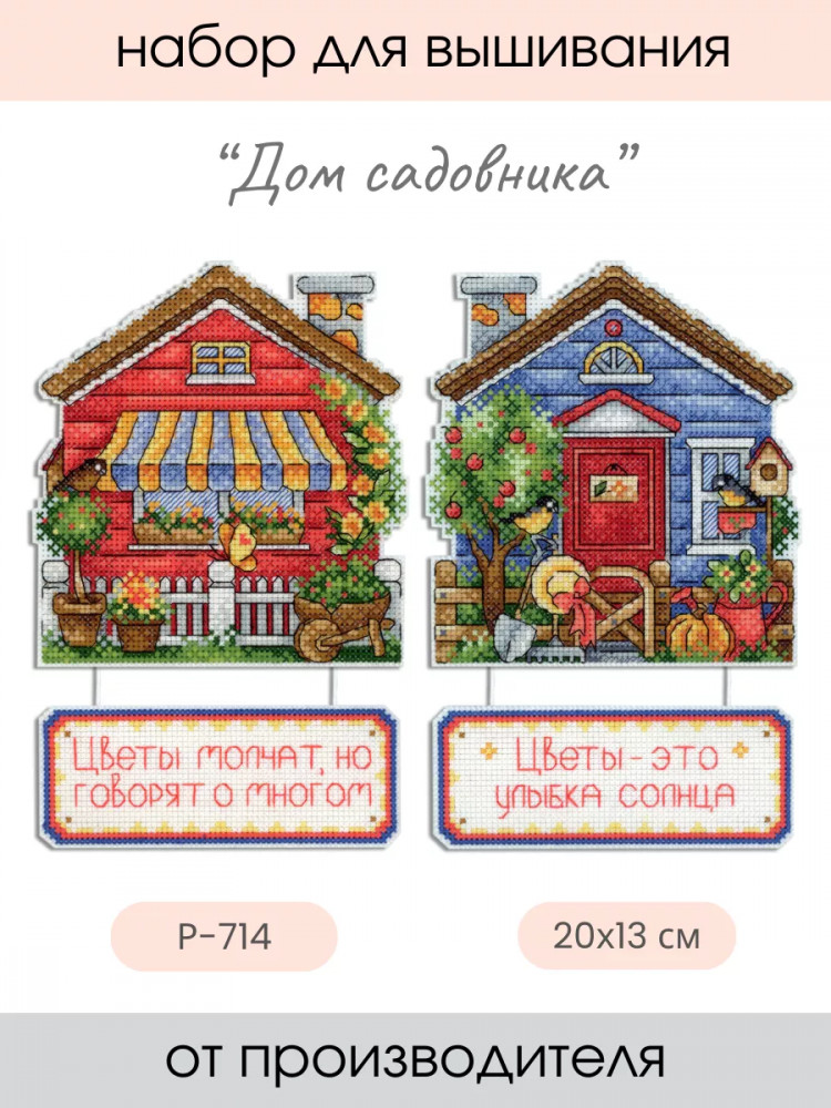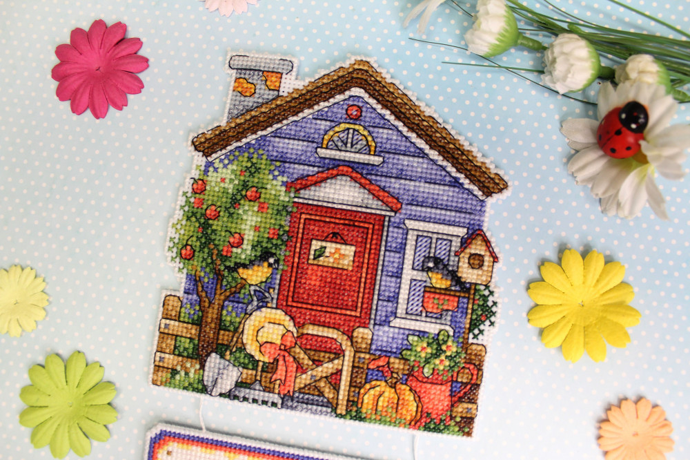Сделайте своими руками яркий сувенир «Дом садовника» — это увлекательно и быстро. Набор подойдет даже начинающим, достаточно проявить терпение, аккуратность и освоить простую технику крест. Пяльцы или рамки не понадобятся — пластиковая канва отлично держит форму. Готовые элементы надо вырезать по контуру и соединить между собой аккуратными стежками. При желании вклейте между деталями ленту-подвес. Украсьте этим сувениром праздничный интерьер или преподнесите его как подарок.