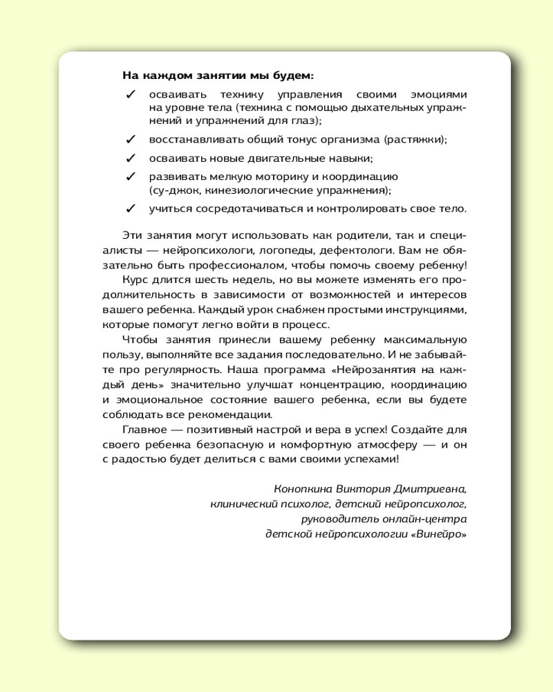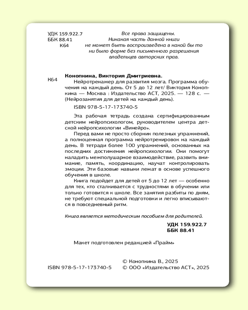 💳 Оплатить за товар можно при получении 🇰🇿 Есть бесплатная доставка по Казахстану 🎁 Копите бонусы с каждой покупки Серия: Нейрозанятия для детей на каждый день Эта рабочая тетрадь создана сертифицированным детским нейропсихологом, руководителем центра детской нейропсихологии «Винейро». Перед вами не просто сборник полезных упражнений, а полноценная программа нейротренировок на каждый день. В тетради более 100 упражнений, основанных на последних достижениях нейропсихологии. Они помогут наладить межполушарное взаимодействие, развить внимание, память, координацию, научат контролировать эмоции. Эти базовые навыки лежат в основе успешного обучения в школе. |