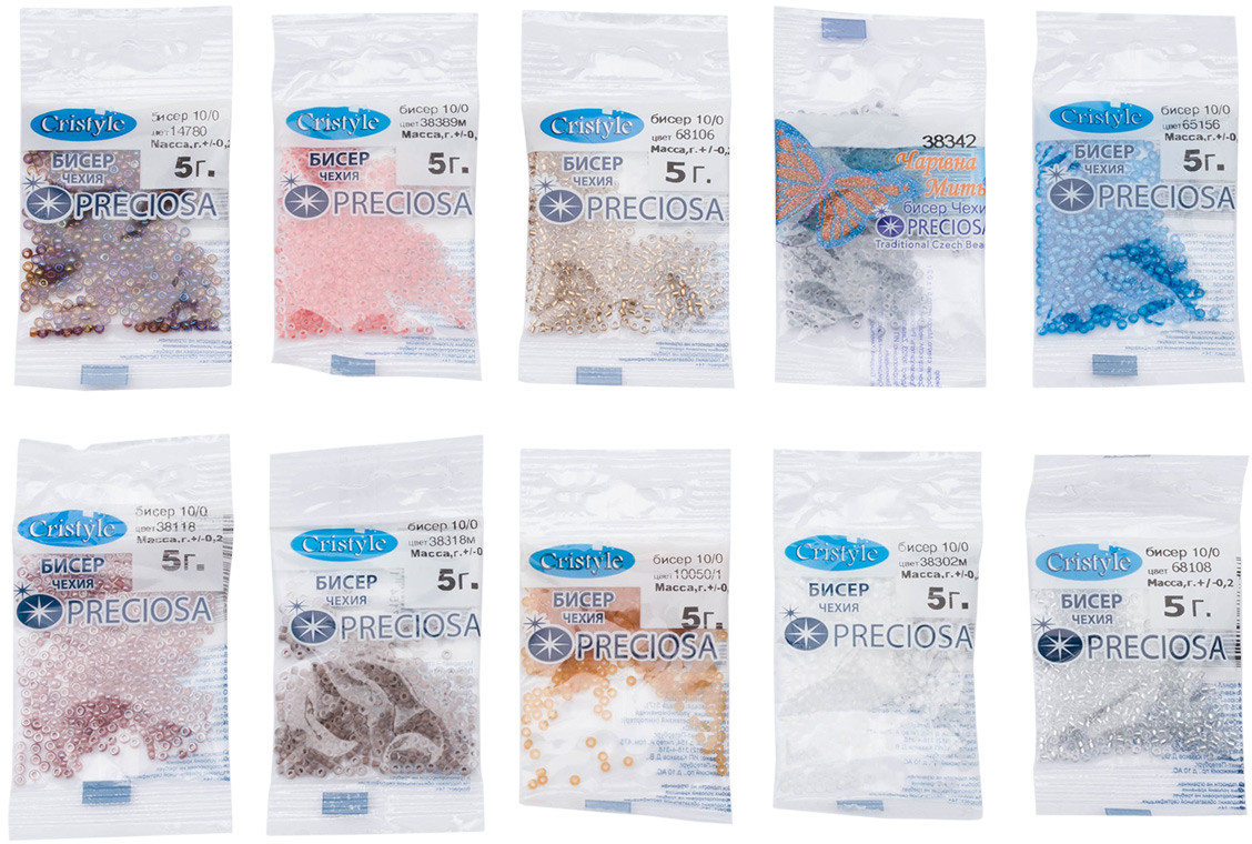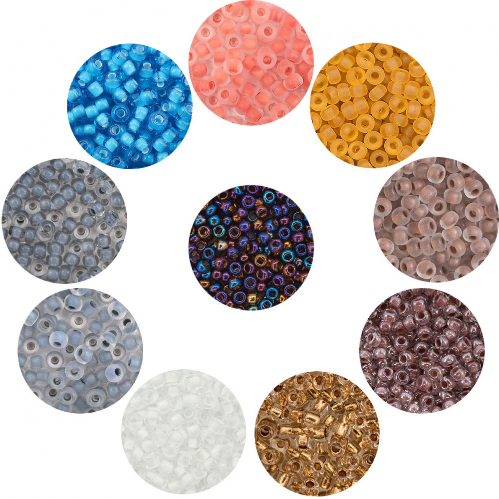 В наборе: 10 цветов бисера по 5 г для каждого цвета (10/0, диаметр 2,3 мм).