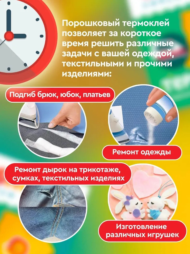Термоплавкий клей для текстиля — идеальное решение для многочисленных задач без использования иглы и нитки. Содержащийся в комплекте порошок обеспечивает быстрое и надежное склеивание различных текстильных изделий. Наш термоклей подходит для широкого спектра применений, включая ремонт одежды и кожгалантереи, починку порезов и дырок на трикотаже, коже и других текстильных изделиях, для приклеивания аппликаций и заплаток, а также изготовления игрушек.