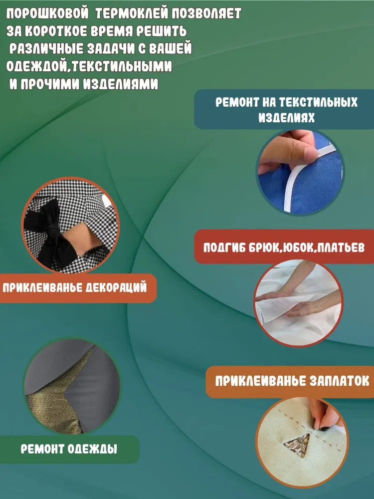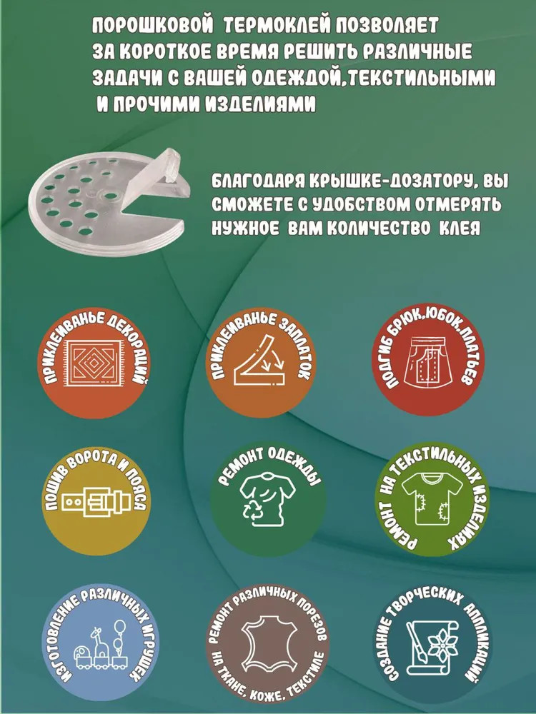 Термоплавкий клей для текстиля — идеальное решение для многочисленных задач без использования иглы и нитки. Содержащийся в комплекте порошок обеспечивает быстрое и надежное склеивание различных текстильных изделий. Наш термоклей подходит для широкого спектра применений, включая ремонт одежды и кожгалантереи, починку порезов и дырок на трикотаже, коже и других текстильных изделиях, для приклеивания аппликаций и заплаток, а также изготовления игрушек.