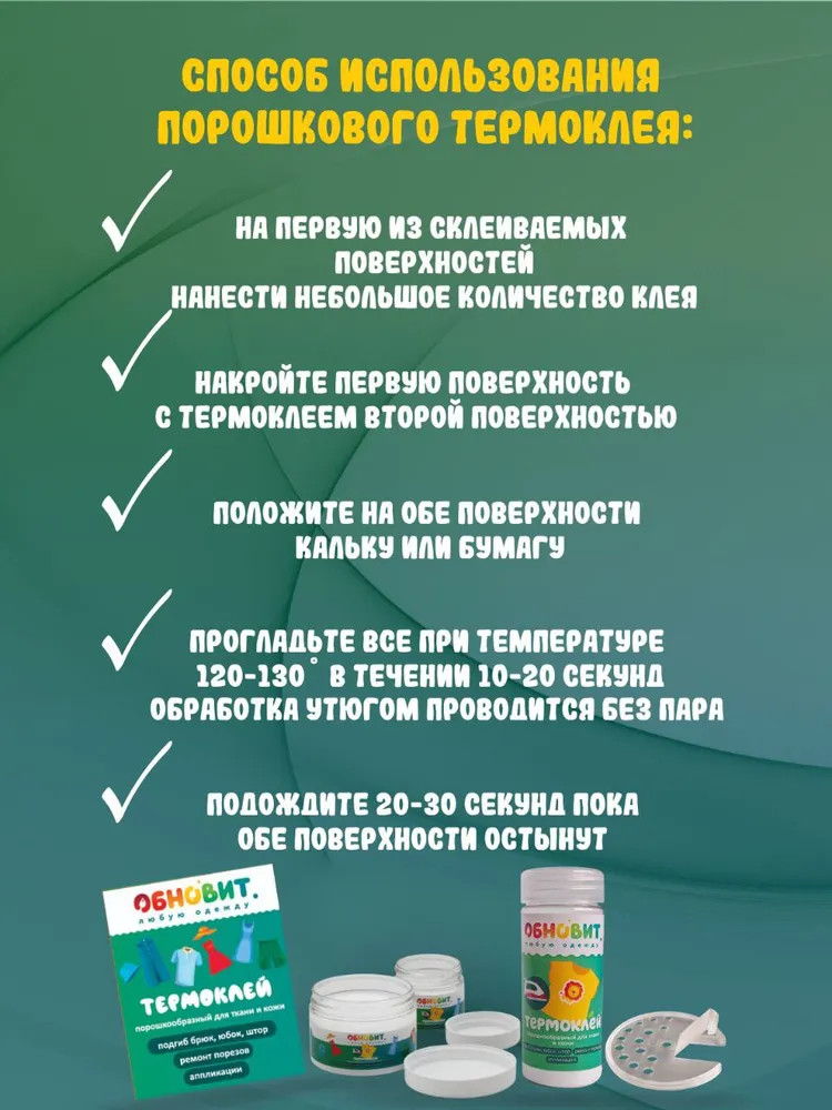 Этот клей для текстиля поставляется в удобной упаковке с дозатором. На месте нанесения термоклея порошкового Обновит образуется паутинка клеевая для ткани, которая надежно соединяет поверхности.