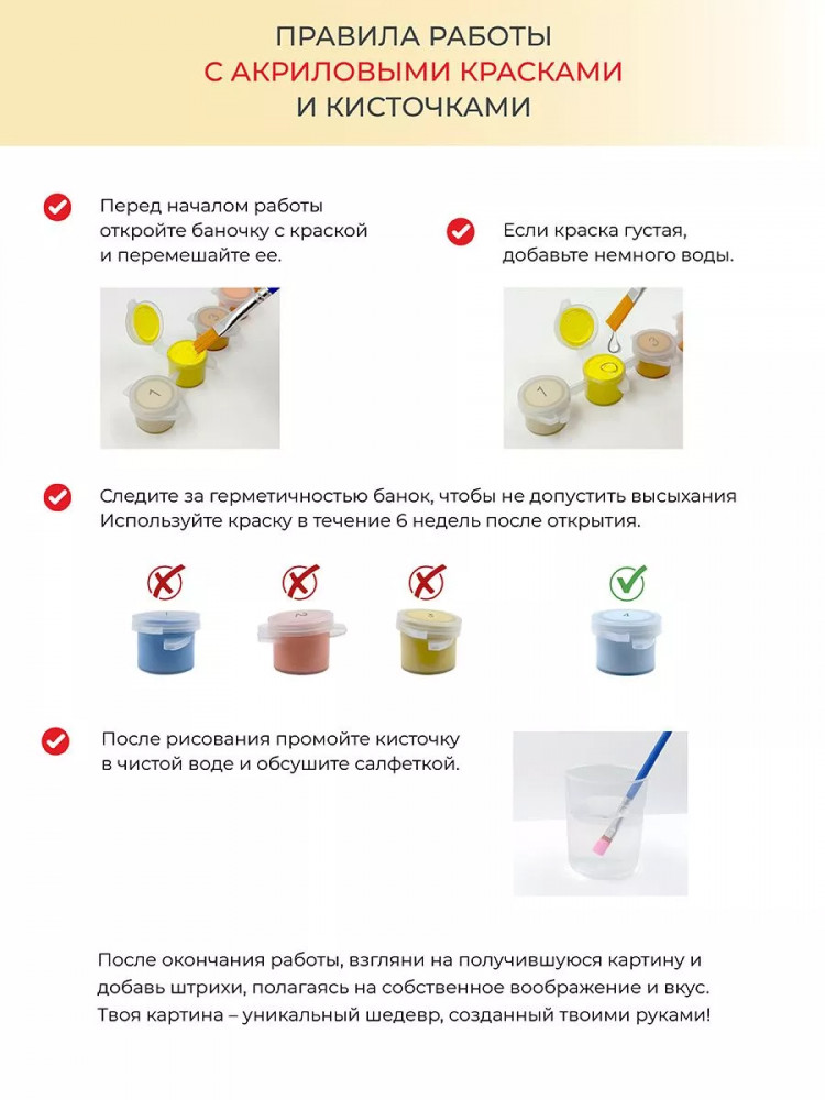 В комплект входят акриловые краски, отличающиеся яркостью и стойкостью. Они быстро сохнут, обеспечивают плотное покрытие и позволяют добиться насыщенных оттенков. Акриловые краски безопасны, так как не содержат токсичных веществ. Три вида кистей позволят проработать как крупные участки изображения, так и мелкие детали, требующие особой аккуратности. Чтобы ваша работа служила долго и радовала глаз, покройте ее финишным лаком, который защитит готовую картину от пыли и других внешних воздействий. Создание картины по номерам станет увлекательным семейным досугом, развивающим творческие способности.