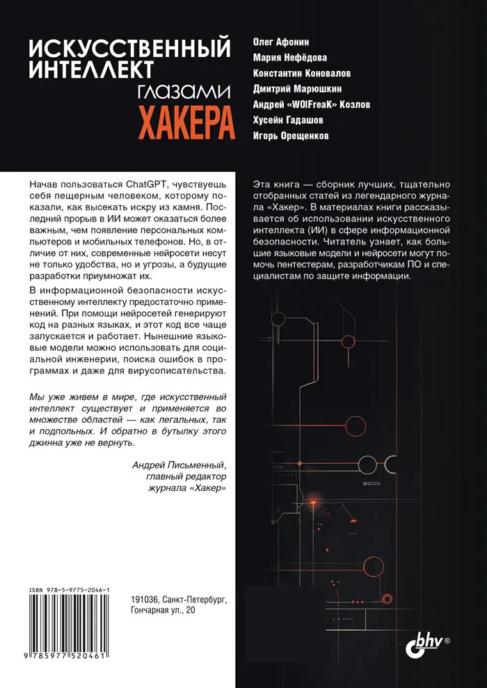 💳 Оплатить за товар можно при получении 🇰🇿 Есть бесплатная доставка по Казахстану от 1 дня 🎁 Копите бонусы с каждой покупки Серия: Глазами хакера Эта книга — сборник лучших, тщательно отобранных статей из легендарного журнала «Хакер». Рассмотрены современные подходы к использованию искусственного интеллекта в области информационной безопасности. Описаны методы обхода ограничений ChatGPT, рассмотрено применение нейросетей для написания эксплойтов и поиска уязвимостей в коде. Представлены практические кейсы использования GPT-4 на багбаунти, приведены способы выманивания паролей с помощью чат-ботов и QR-кодов. Даны рекомендации по применению нейросетей и языковой модели Llama для анализа и поиска критичных данных в коде программ. Отдельное внимание уделено генеративному ИИ: показана карта его возможностей, а также способы улучшения изображений с помощью нейросетей. Книга станет ценным источником знаний для тех, кто хочет изучить искусственный интеллект через призму хакерских технологий. |