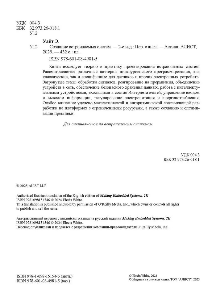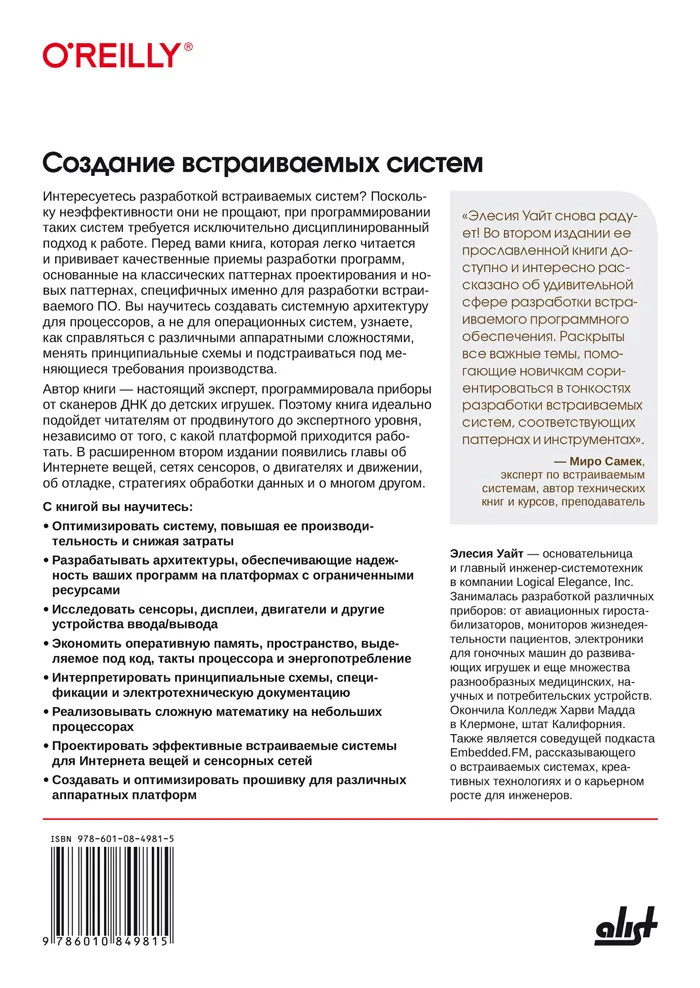 💳 Оплатить за товар можно при получении 🇰🇿 Есть бесплатная доставка по Казахстану от 1 дня 🎁 Копите бонусы с каждой покупки Книга исследует теорию и практику проектирования встраиваемых систем. Рассматриваются различные паттерны низкоуровневого программирования, как классические, так и специфичные для датчиков и прочих электронных устройств. Затронутые темы: обработка сигналов, реагирование на прерывания, объединение устройств в сеть, обеспечение безопасного хранения данных, работа с интеллектуальными устройствами, входящими в состав Интернета вещей, управление вводом и выводом информации, регулирование электропитания и энергопотребления. Особое внимание уделено математической и алгоритмической составляющей разработки на платформах с ограниченными ресурсами, а также созданию и оптимизации прошивки. |