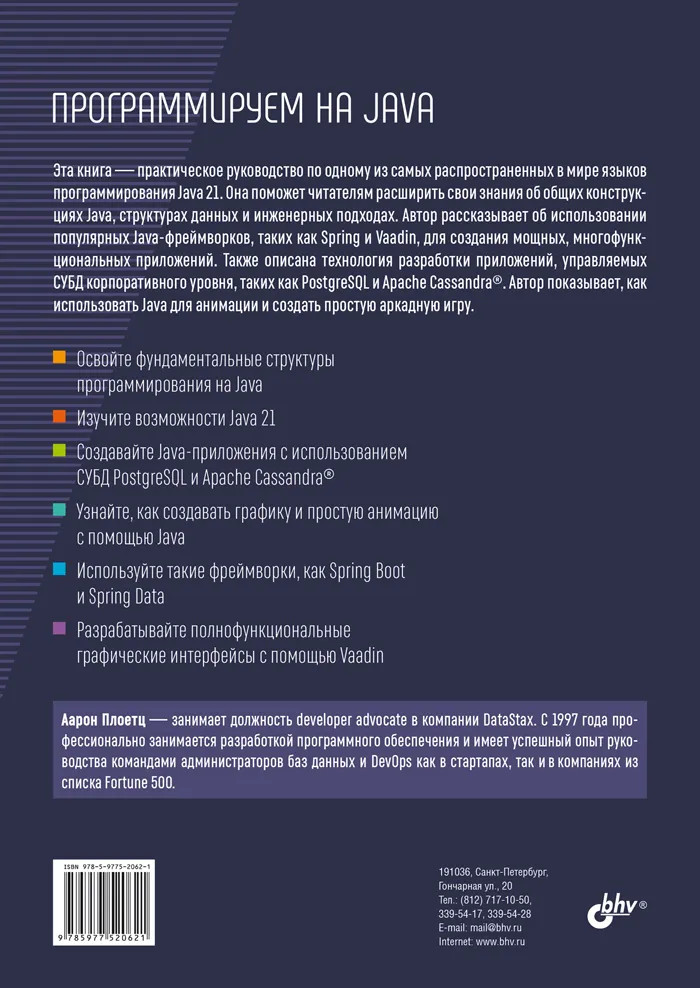 💳 Оплатить за товар можно при получении 🇰🇿 Есть бесплатная доставка по Казахстану от 1 дня 🎁 Копите бонусы с каждой покупки Книга о современном программировании на Java, охватывающая новые возможности Java 21 и практическое применение языка для создания многофункциональных приложений. Подробно рассматриваются ключевые концепции, структуры данных, работа с реляционными базами данных PostgreSQL и Apache Cassandra®, а также использование фреймворков Spring Boot и Spring Data. Отдельное внимание уделено разработке графики, анимации и даже небольших аркадных игр на Java. Рассматриваются лучшие практики построения программной архитектуры, создания графических интерфейсов и веб-приложений с помощью Vaadin. Книга будет полезна как начинающим разработчикам, так и опытным специалистам, желающим освоить новые возможности Java 21 и углубить знания в области современного программирования. |