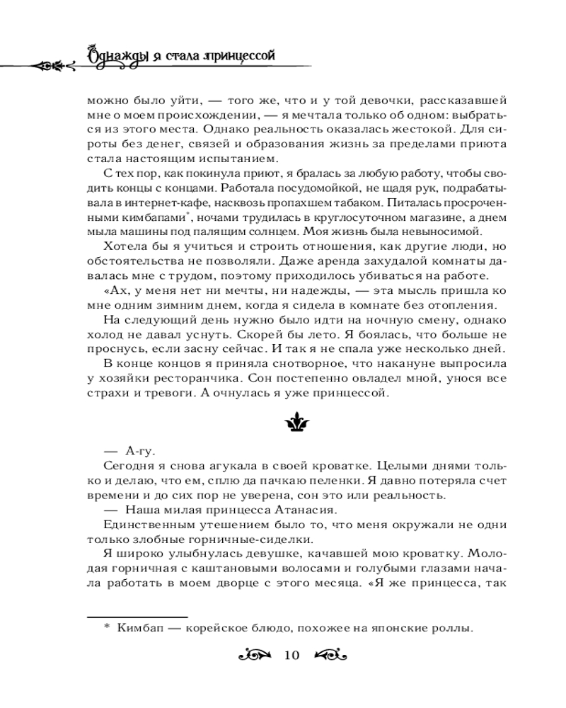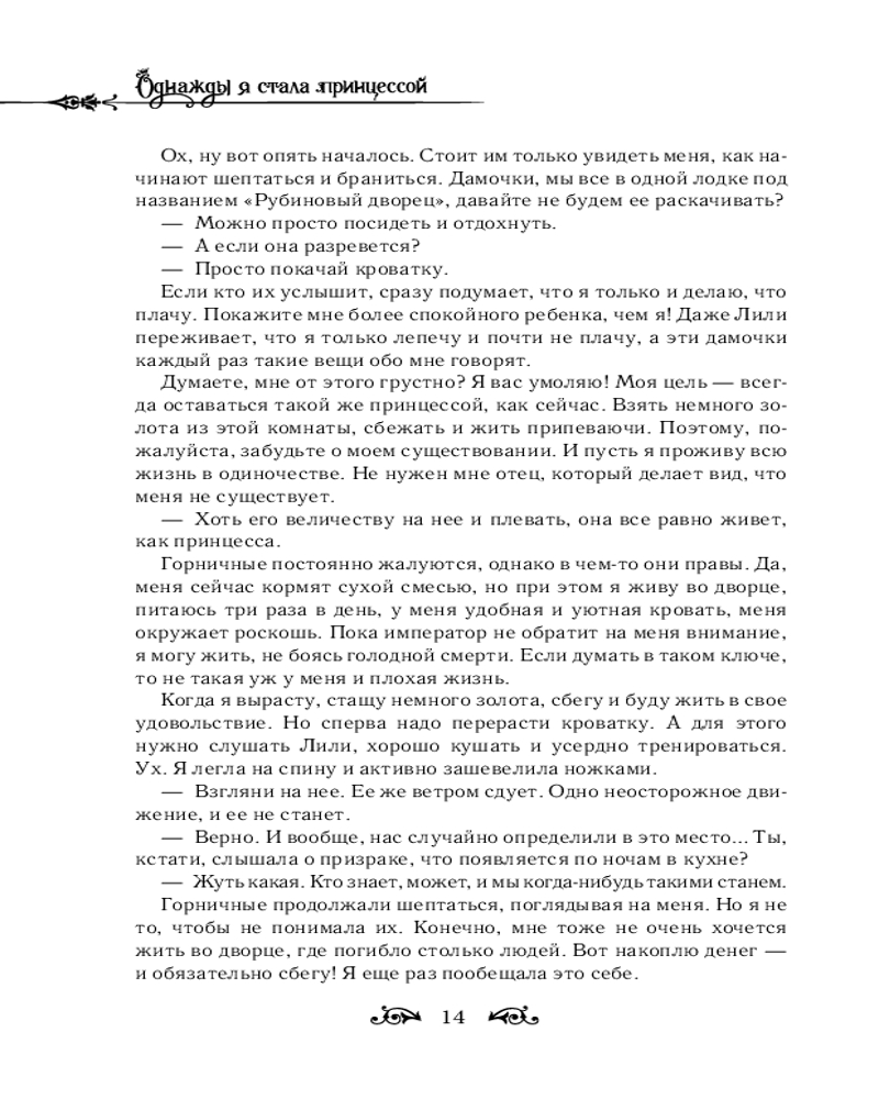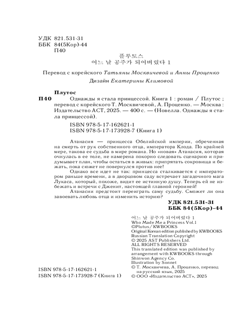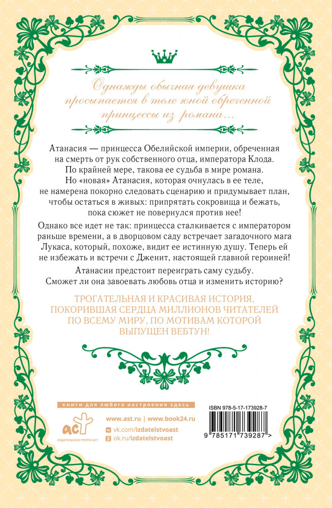 Однажды я стала принцессой. Книга 1В данный момент этот товар отсутствует в продаже. Возможно, у нас найдется аналогичный или похожий товар здесь. Серия: Новелла. Однажды я стала принцессой Атанасия — принцесса Обелийской империи, обреченная на смерть от рук собственного отца, императора Клода. По крайней мере, такова ее судьба в мире романа. Но «новая» Атанасия, которая очнулась в ее теле, не намерена покорно следовать сценарию и придумывает план, чтобы остаться в живых: припрятать сокровища и бежать, пока сюжет не повернулся против нее! Однако все идет не так: принцесса сталкивается с императором раньше времени, а в дворцовом саду встречает загадочного мага Лукаса, который, похоже, видит ее истинную душу. Теперь ей не избежать и встречи с Дженит, настоящей главной героиней! Атанасии предстоит переиграть саму судьбу. Сможет ли она завоевать любовь отца и изменить историю? |