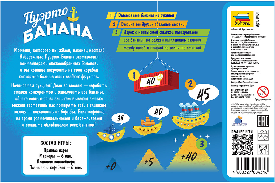 Момент, которого вы ждали, наконец настал! Набережные Пуэрто-Банана заставлены контейнерами свежесобранных бананов, и вы хотите погрузить на свои корабли как можно больше этих сладких фруктов. Начинается аукцион! Всё очень просто: вы сначала делаете тайные ставки, а затем распределяете выигрыш. Загвоздка в том, что тот, чья ставка будет наибольшей в раунде, хоть и выиграет все бананы, но должен будет отдать разницу между своей и второй по величине ставкой. Балансируйте на грани расточительности и бережливости и станьте обладателем всех бананов! |