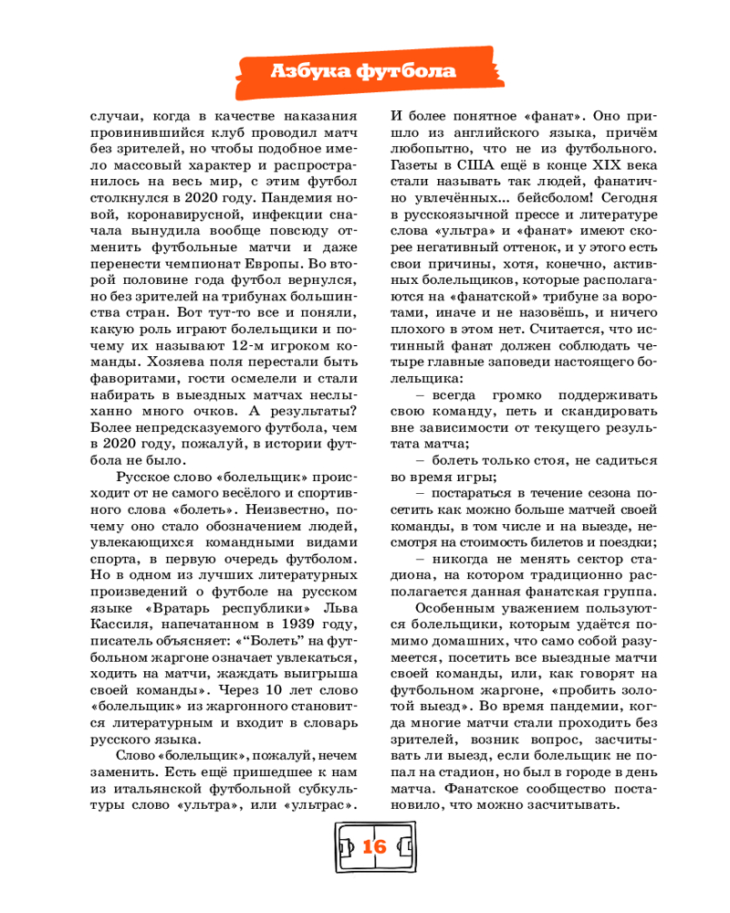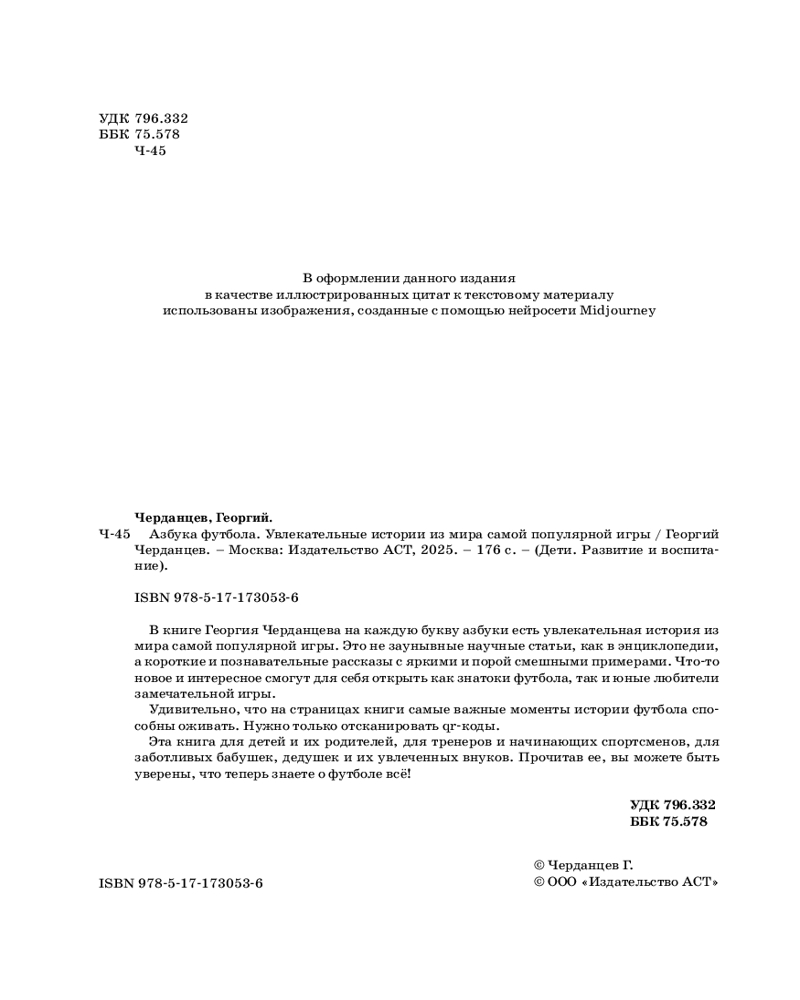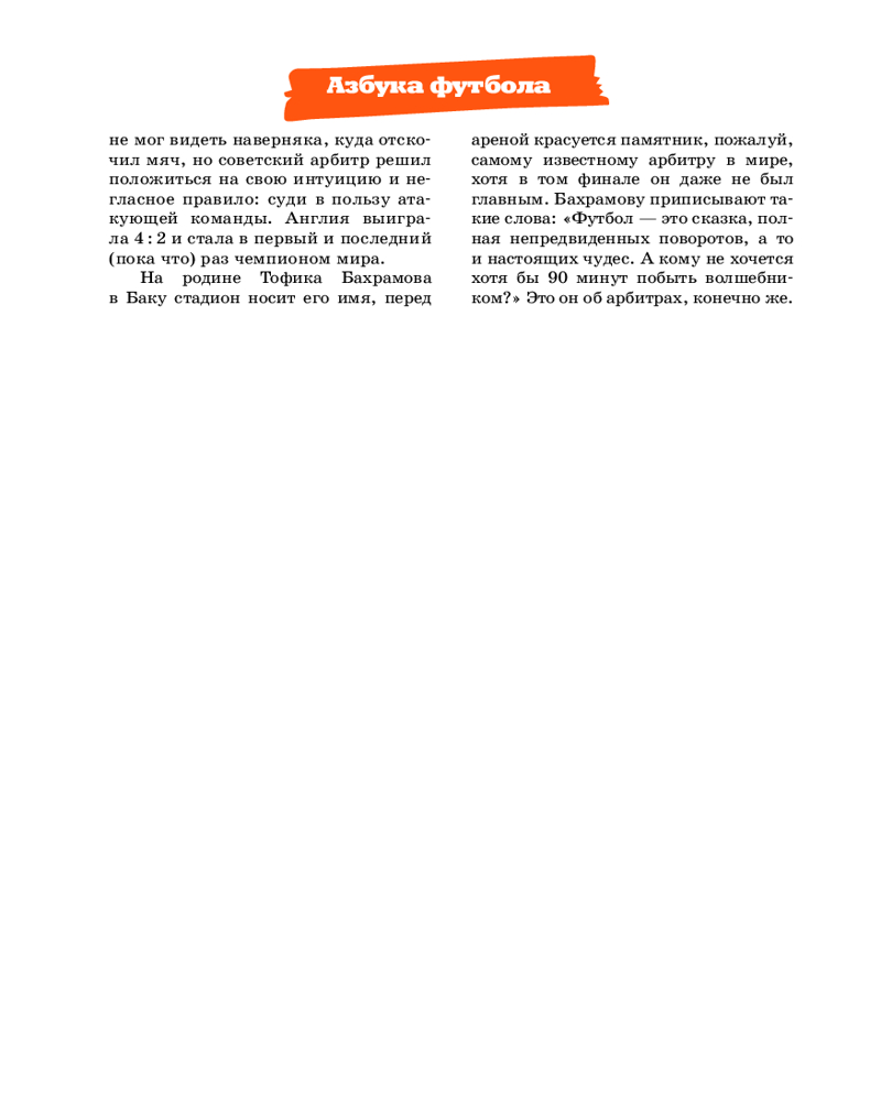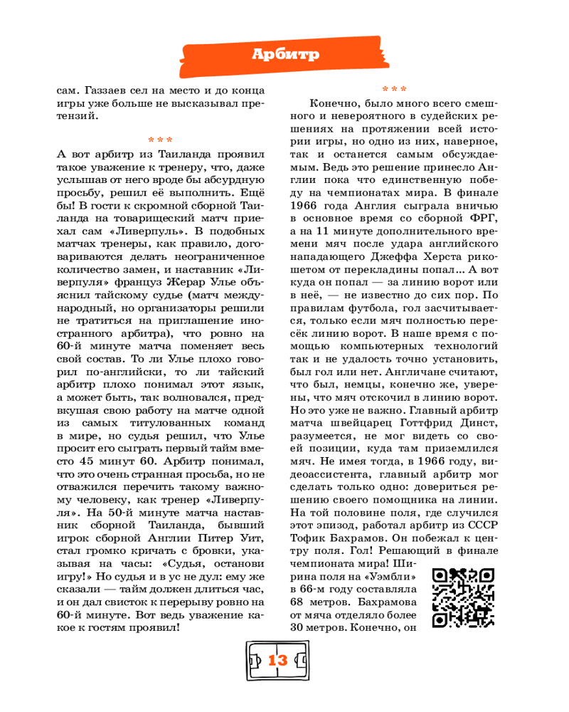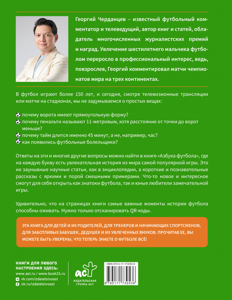 Ответы на эти и многие другие вопросы можно найти в книге «Азбуке футбола», где на каждую букву есть увлекательная история из мира самой популярной игры. Это не заунывные научные статьи, как в энциклопедии, а короткие и познавательные рассказы с яркими и порой смешными примерами. Что-то новое и интересное смогут для себя открыть как знатоки футбола, так и юные любители замечательной игры. Удивительно, что на страницах книги самые важные моменты истории футбола способны оживать. Нужно только отсканировать qr-коды. Эта книга для детей и их родителей, для тренеров и начинающих спортсменов, для заботливых бабушек, дедушек и их увлеченных внуков. Прочитав ее, вы можете быть уверены, что теперь знаете о футболе всё! |