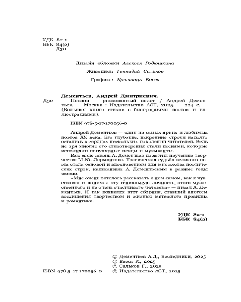 💳 Оплатить за товар можно при получении 🇰🇿 Есть бесплатная доставка по Казахстану 🎁 Копите бонусы с каждой покупки Серия: Большая книга стихов с биографиями поэтов и иллюстрациями Андрей Дементьев — один из самых ярких и любимых поэтов XX века. Его глубокие, искренние строки надолго остались в сердцах нескольких поколений читателей. Ведь не зря многие его стихотворения стали песнями, которые исполняли популярные певцы и музыканты. Всю свою жизнь Андрей Дмитриевич посвятил изучению творчества Михаила Лермонтова. Трагическая судьба великого поэта стала источником вдохновения для множества поэтических строк, написанных Дементьевым в разные годы жизни. |