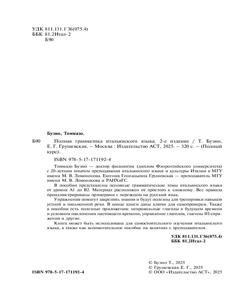 Томмазо Буэно — доктор филологии (диплом Флорентийского университета) с 20-летним опытом преподавания итальянского языка и культуры Италии в МГУ имени М. В. Ломоносова. Евгения Геннадьевна Грушевская — преподаватель МГУ имени М. В. Ломоносова и РАНХиГС. В пособии представлены основные грамматические темы итальянского языка от уровня А1 до В2. Материал расположен от простого к сложному. Все правила проиллюстрированы примерами с переводом на русский язык.