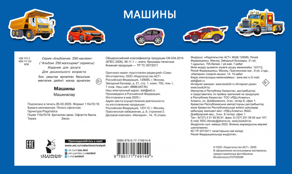 💳 Оплатить за товар можно при получении 🇰🇿 Есть бесплатная доставка по Казахстану от 1 дня 🎁 Копите бонусы с каждой покупки Серия: 250 наклеек. Альбом «Машины» — это более 250 стикеров и 6 страниц цветных фонов для безграничной детской фантазии. Играя с книжкой, мальчишки познакомятся с автомобильной техникой, узнают названия городского транспорта. Весёлые уроки окружающего мира развивают воображение, память и внимание, способствуют развитию речи, зрительного восприятия и мелкой моторики. Книга с мелованными страницами отличного качества — поэтому стикеры можно наклеивать много раз! Для дошкольного возраста. |