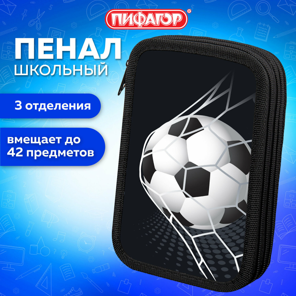 Пенал Пифагор яркого дизайна с тремя отделениями выполнен из ламинированного картона, имеет тканевый торец. Удобные молнии с металлическим бегунком с трех сторон, прочные резинки для предметов. Вмещает до 42 предметов. Материал пенала — ламинированный картон с цветной печатью, ярким дизайном. Основа пенала — плотный картон, обшитый тканью по краям, с тканевым торцом. Такая конструкция отличается износостойкостью и прочностью, поможет защитить канцелярские принадлежности от повреждений.