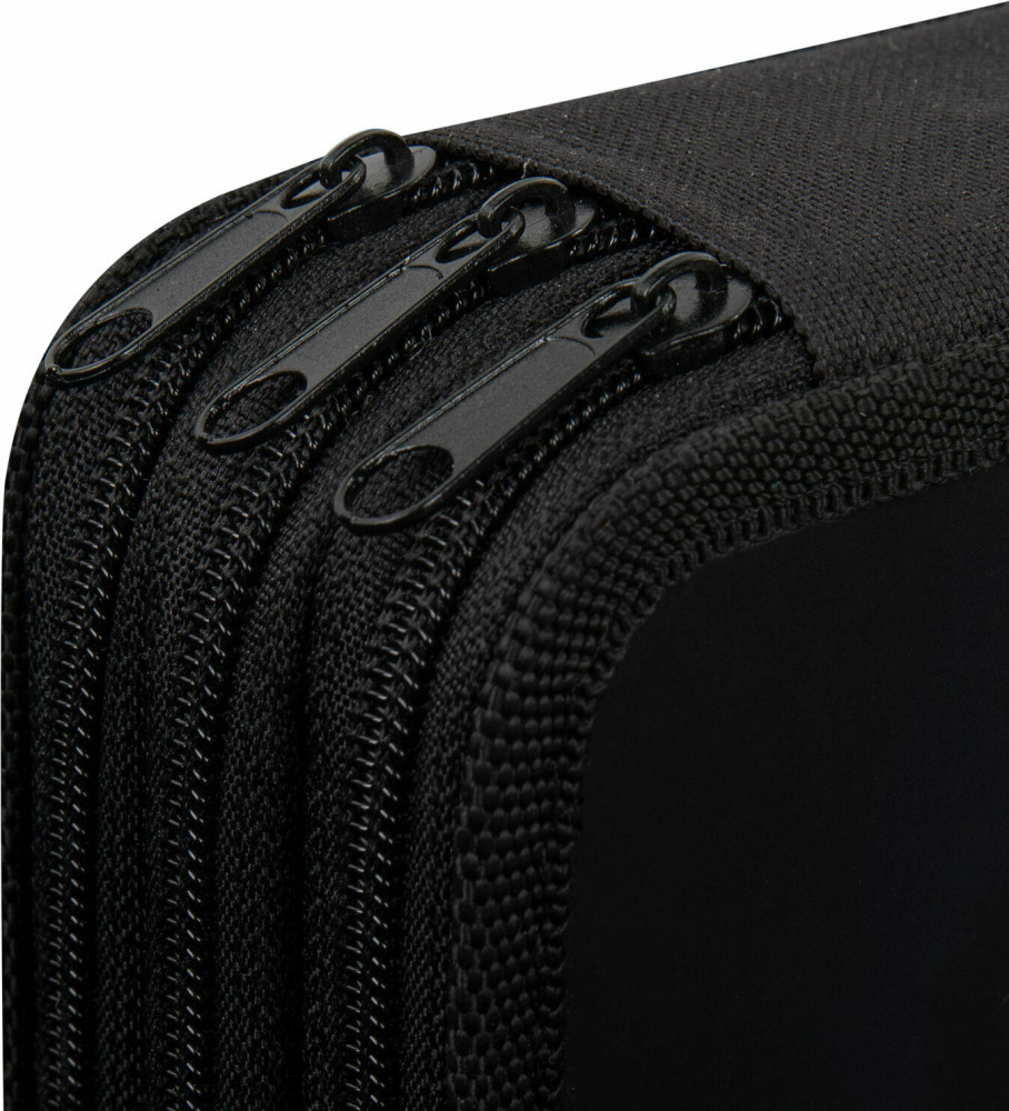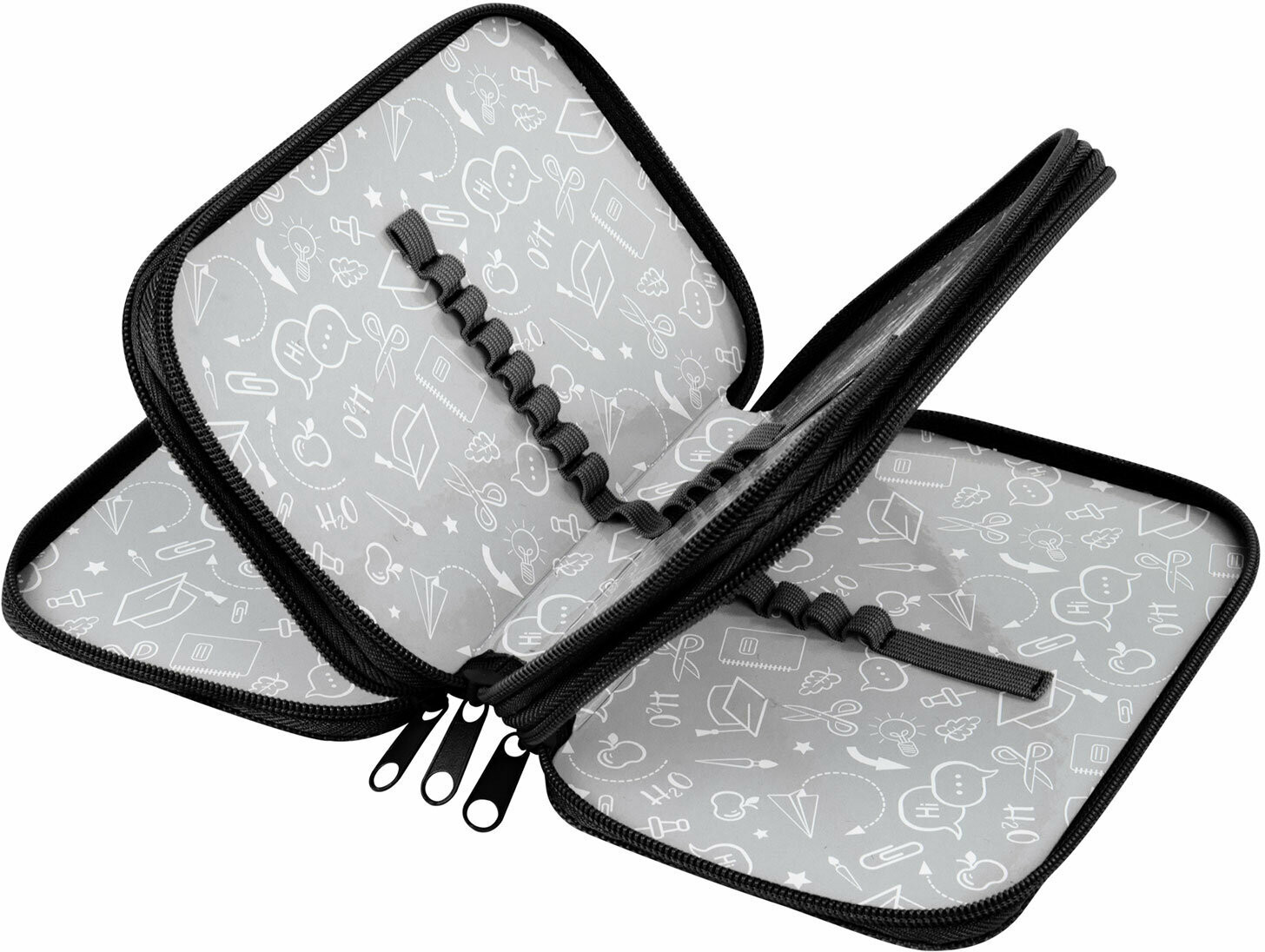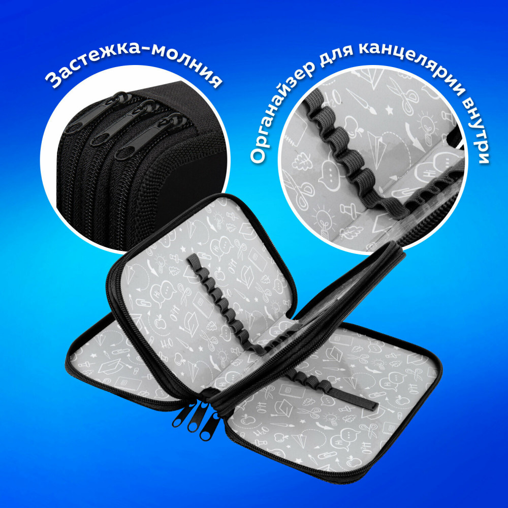 Пенал имеет 3 отделения, внутри на каждой створке имеются прочные резинки для канцелярских принадлежностей. Внутренняя часть выполнена из картона с глянцевой ламинацией с узором. Пенал стандартного размера 19×11 см, что позволяет легко размещать его в ранце, рюкзаке или сумке. Хорошая наполняемость пенала дает возможность держать под рукой все необходимые для уроков канцтовары. Упакован в ПЭТ-пакет на клейкой ленте и с европодвесом. Позволяет сохранить качество товара при транспортировке и удобно размещать его в магазине.