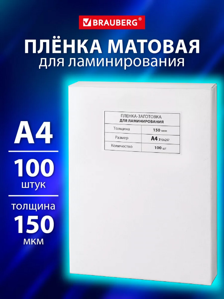 Пленка для ламинирования Brauberg надежно защитит документы от влаги, пыли, воздействия УФ-лучей и других внешних факторов. Представляет собой двойной пакет, спаянный с одной стороны (содержание полиэстера > 50%). Документ вкладывается между слоями пленки и в дальнейшем подвергается термообработке в ламинаторе. Суммарная толщина пленки-заготовки — 300 (150×2) мкм, что позволяет защитить документы и увеличить жесткость, сохраняя яркость изображения.