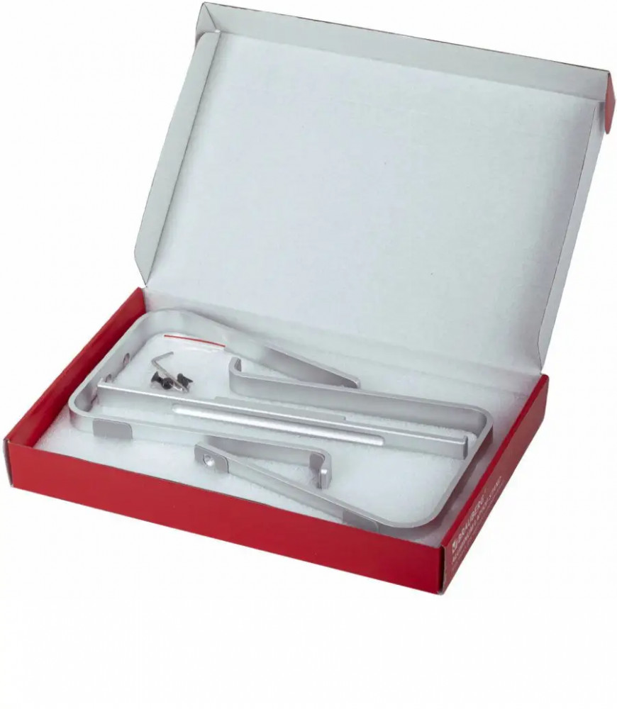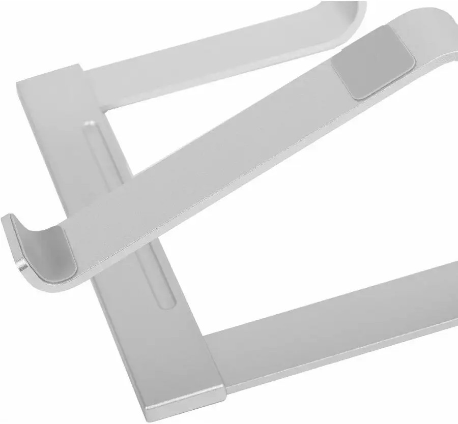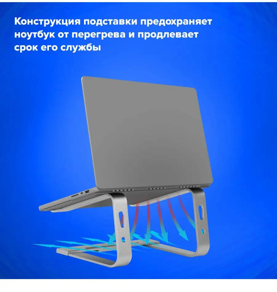 Жесткая конструкция из металла выдерживает нагрузку ноутбука. У подставки регулируется ширина — её можно настроить для различных диагоналей ноутбука. Резиновые вставки на ножках предотвращают скольжение по поверхности стола, добавляя подставке устойчивости. Максимальная нагрузка — до 10 кг.
